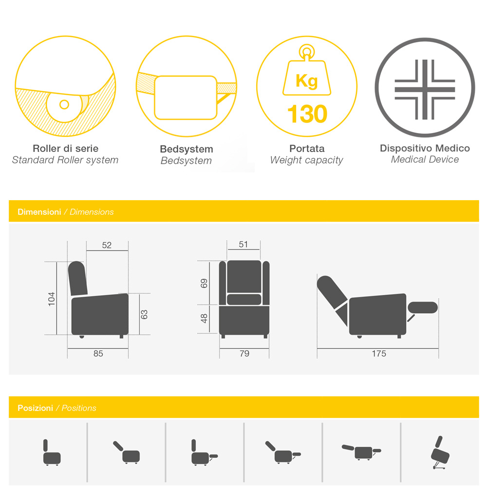 كرسي بذراعين مصنوع من هيكل من الحديد والخشب ، مبطن برغوة البولي يوريثان غير القابلة للتشوه بكثافات متباينة ، وميكانيكا بمحركين مع وظائف الرفع / الاسترخاء / السرير وقماش عالي الجودة مع مقاومة عالية للتآكل وبكرات كمعيار.