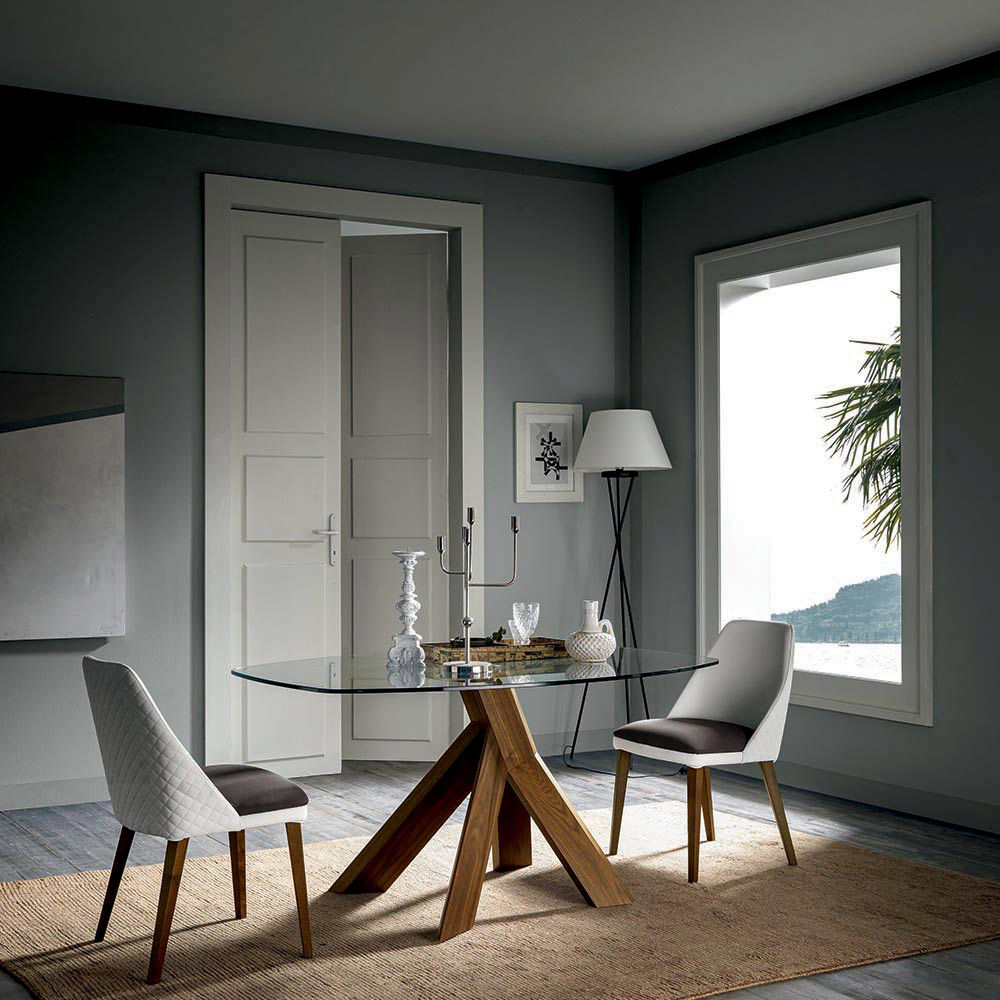 طاولة طعام مصنوعة من الزجاج وأرجل من الخشب المقشر مصنوعة في إيطاليا.