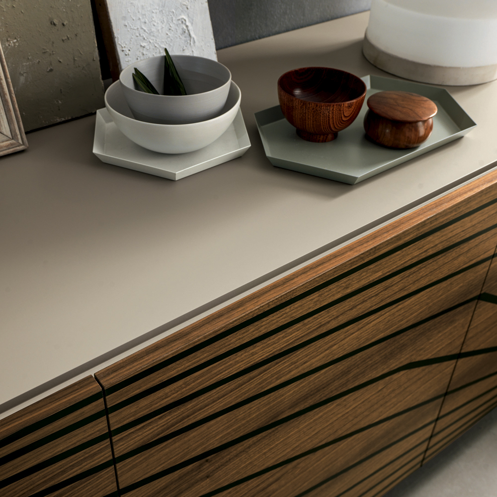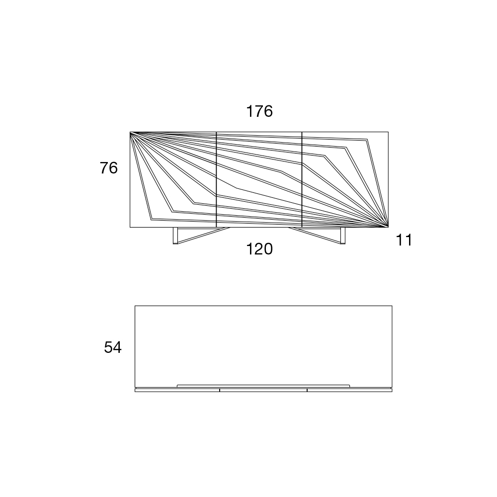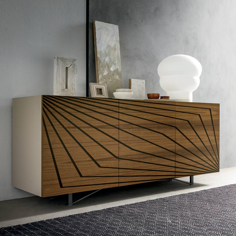 تتميز هذه الخزانة الجانبية لغرفة المعيشة بهيكل مصنوع بالكامل من MDF مطلي بالورنيش مع 3 أبواب مكسوةبتطعيمات حريرية و 3 أرفف داخلية من الزجاج المقسّى الشفاف . إن خصوصية ملحق التأثيث تتجلى في الخطوط التي تتقارب عند النقاط الخارجية لتشكل تأثيرًا بصريًا حصريًا ، لتصميم يقدم نفسه كلوحة تجريدية مميزة للغاية.