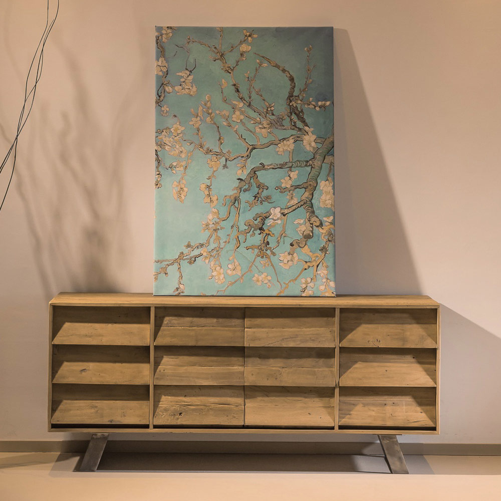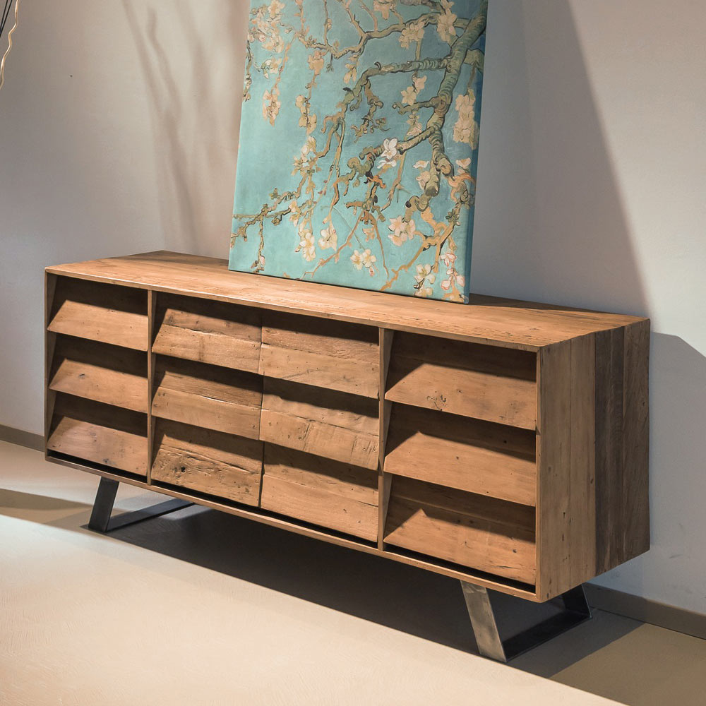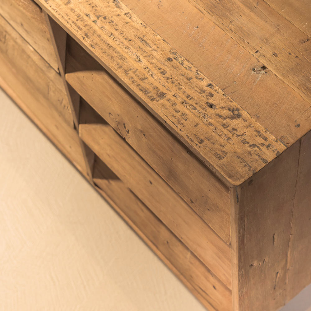 خزانة جانبية داخلية مصنوعة من الخشب المعاد تدويره بلون القهوة الطبيعي مع واجهات دائمة و 2 باب وسطي و 6 أدراج جانبية . هذه المجموعة من الأثاث فريدةٌ من نوعها، لأنها تُجسّد التاريخ العريق لهذه المادة المُستخدمة. صُنعت هذه المجموعة يدويًا إلى حد كبير. كل خدش أو عيب، وكل ندبة على الخشب، تشهد على أصالة الماضي الذي أُعيد إحياءه. يُعالَج الخشب الاستوائي المُعاد تدويره ، والمُستخرج من التحف القديمة والقوارب والمباني المهجورة، ويُنظّف بمهارة لاستعادة رونقها ولمعانها. يجمع هذا المنتج بين جوهر الذوق الريفي وأشكال التصميم المعاصر وبعض تفاصيل الطراز الصناعي .