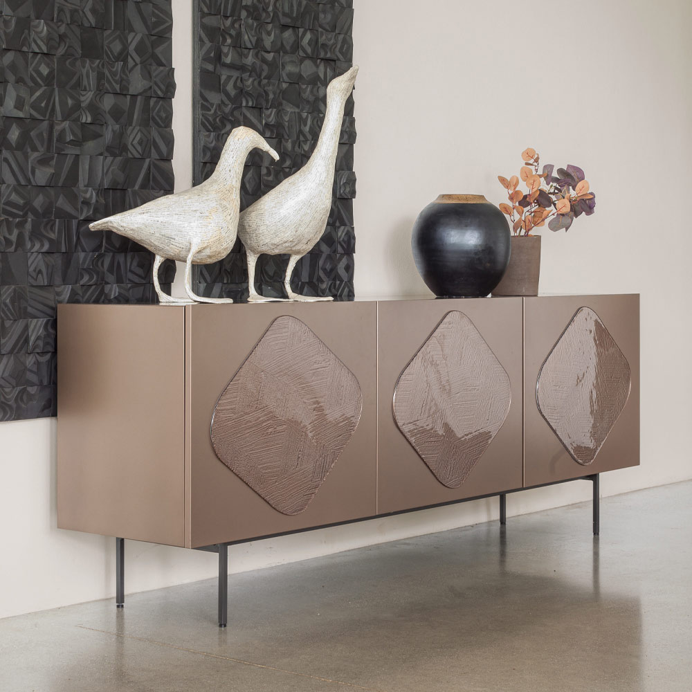 خزانة جانبية لغرفة المعيشة مصنوعة من اللوح الخشبي المطلي باللون البني المعدني ، وأبواببإدخالات زجاجية منسقة من نفس اللون، ورفين داخليين وأقدام معدنية ، مصنوعة بالكامل في إيطاليا. مزيجٌ من الأناقة والعملية يُضفي جمالاً على البيئات العصرية. يتميز بطبقة طلاء لاكيه عالية الجودة، تُضفي سطحاً أملساً ومظهراً لامعاً يجذب الأنظار. لا يقتصر اختيار الطلاء على الجانب الجمالي فحسب، بل عملي أيضاً، إذ يوفر حمايةً طويلة الأمد من التآكل اليومي، مما يُحافظ على جمال الخزانة الجانبية مع مرور الوقت. ويُعزز التصميم أيضاً الأرجل المعدنية الرفيعة التي تستقر عليها الخزانة. ترفع هذه الأرجل الخزانة عن الأرض، مما يُضفي شعوراً بالخفة والرحابة على قطعة الأثاث بأكملها. ويبرز تأثير الخفة من خلال اللمسة النهائية اللامعة التي تُميز الأبواب، وهي لمسة تُضفي لمسةً من الرقي والحداثة على التصميم.