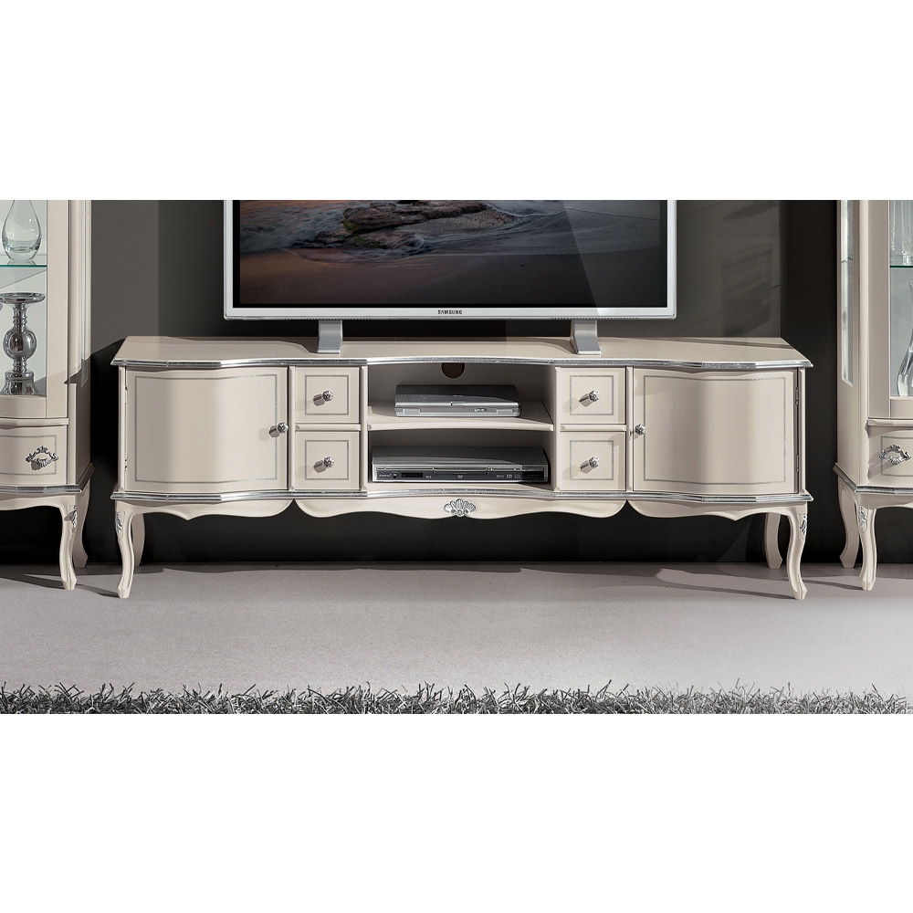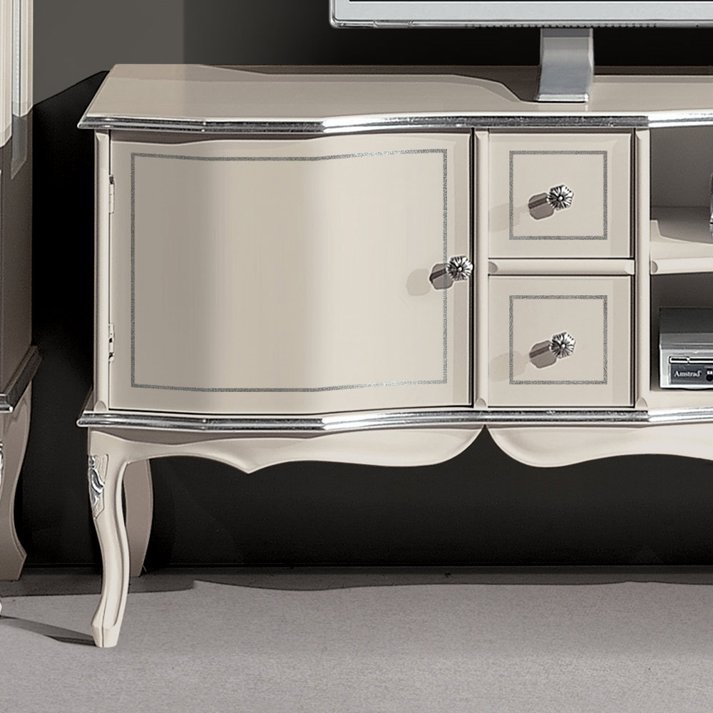حامل تلفزيونكلاسيكي لغرفة المعيشة، مزود ببابين وأربعة أدراج وحجرتين. يتجلى الأسلوب والحرفية اللذان يميزان هذه القطعة الفاخرة المصنوعة من خشب أبيض فاخر بتفاصيل فضية، في قطعة أثاث راقية تُضفي لمسةً من الأناقة على المكان الذي توضع فيه. صُنعت بالكامل في إيطاليا يدويًا على يد حرفيين ماهرين ، وتتميز بمهارة عالية وذوق رفيع. يُصنع المنتج باستخدام مواد عالية الجودة ، وتُصنعيدويًا بأقصى درجات العناية والاحترافية التي تميز المنتجات المصنوعة في إيطاليا .