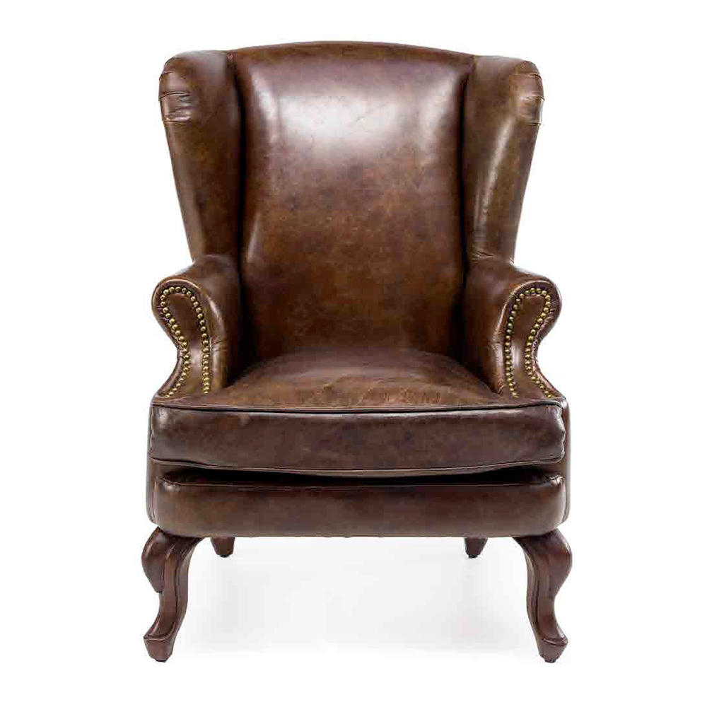 كرسي قراءة مصنوع من الجلد الحقيقي باللون البني الداكن، على الطراز الإنجليزي الكلاسيكي.