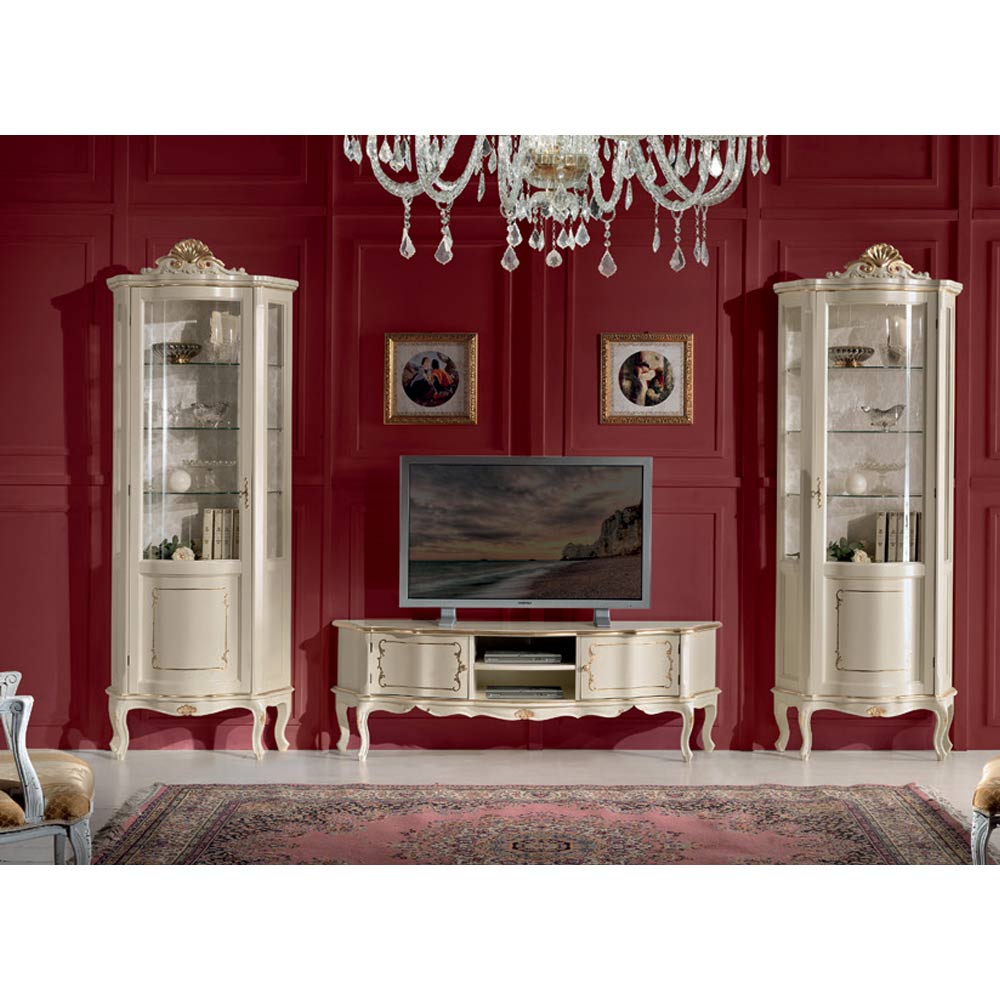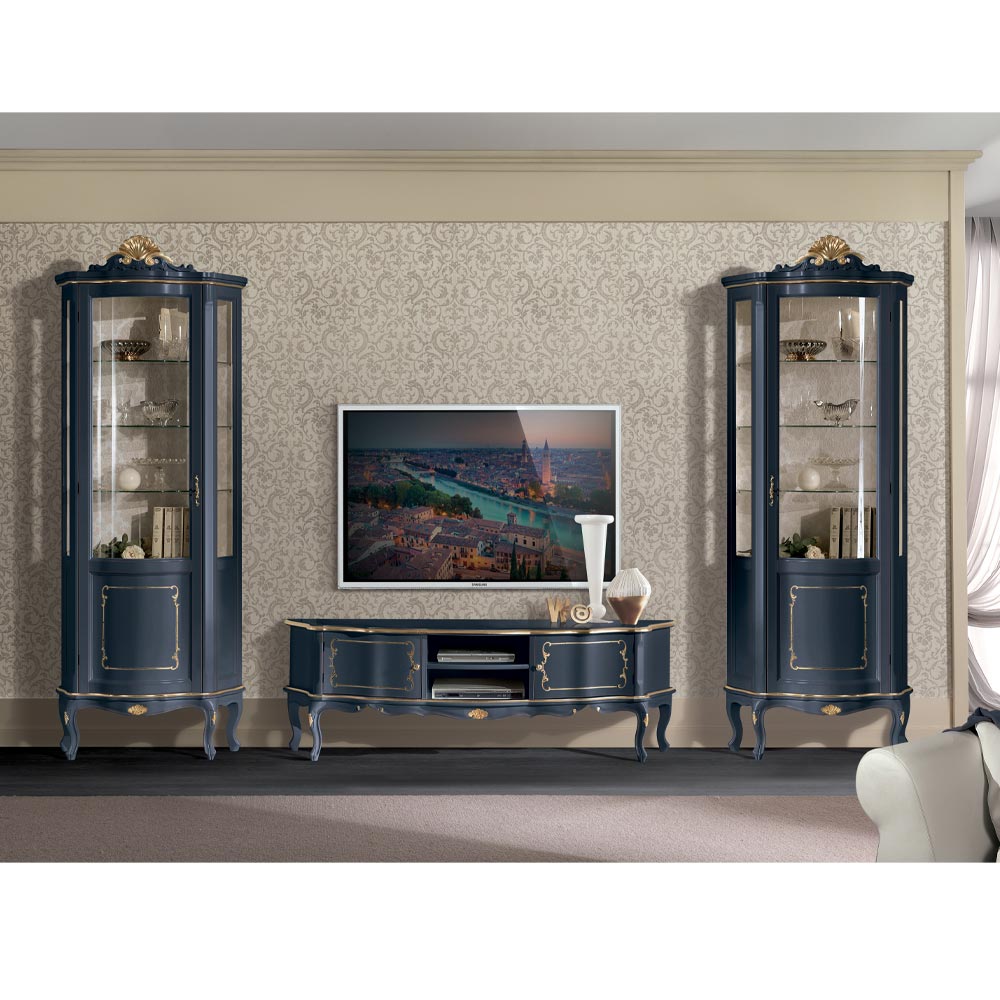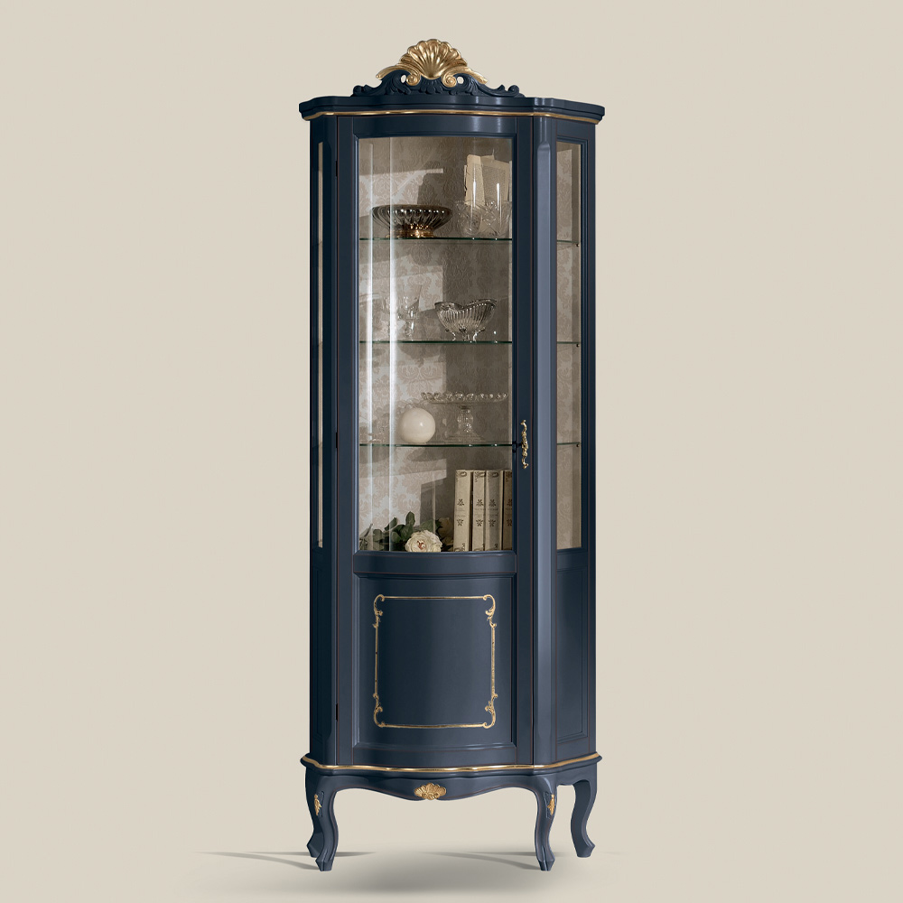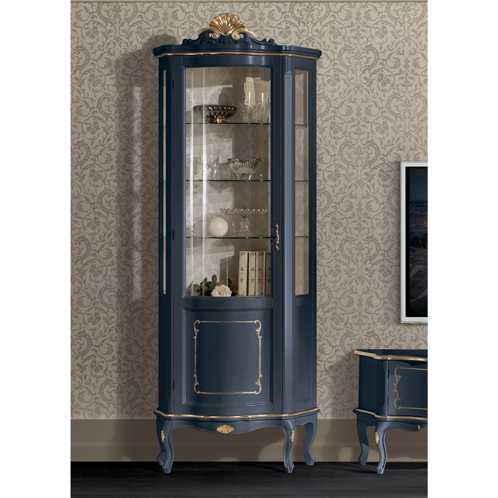 خزانة عرض لغرفة المعيشة ، مصنوعة من خشب أزرق أو أبيض وذهبي، بباب، مثالية لتزيين أي غرفة معيشة بذوق رفيع وأناقة . متوفرة بنسخة بباب يفتح يمينًا أو يسارًا. قطعة فريدة وراقية، مصنوعة بالكامل في إيطاليا على يد حرفيين ماهرين ، خبراء في الفن ، يُكملون كل قطعة ببراعة وذوق رفيع. يُصنع باستخدام أجود الخامات ، ويُنجز العمليدويًا بأقصى درجات العناية والاحترافية التي تُميز المنتجات المصنوعة في إيطاليا .