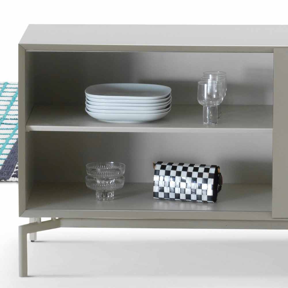 خزانة جانبية من الخشب متوسط الكثافة مطلية باللون الرمادي الفاتح مع حجرة مفتوحة مطلية باللون الرمادي الدافئ.