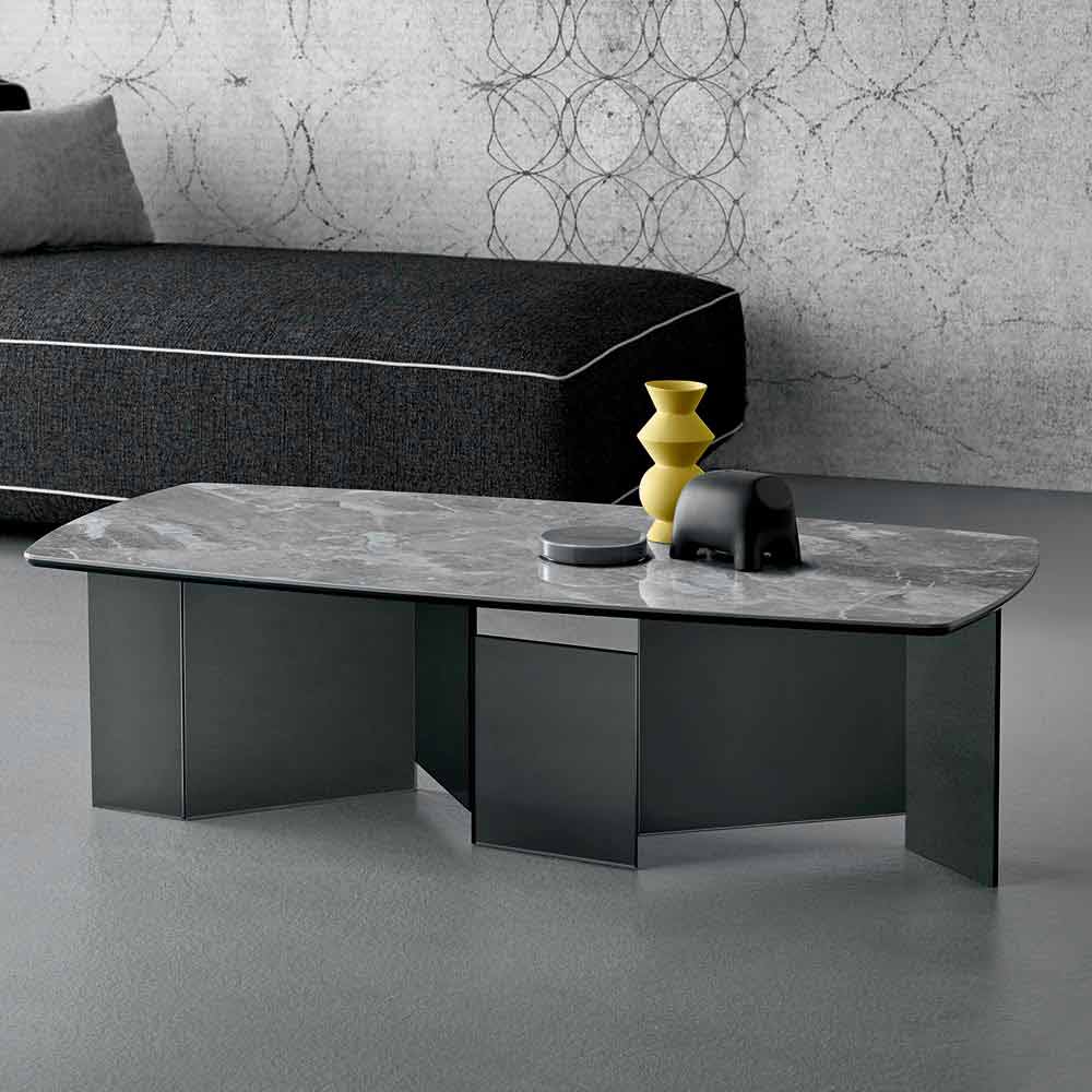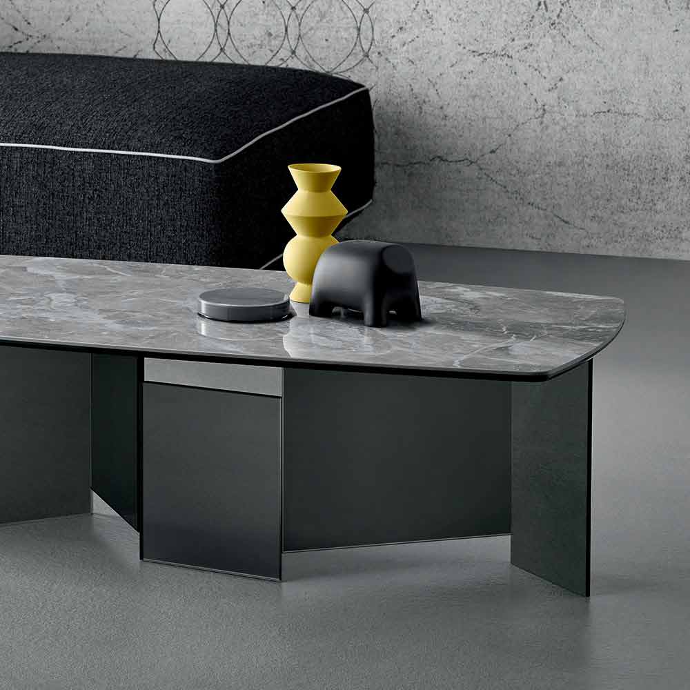 مصنوعة من الزجاج المدخن للقاعدة وسطح من السيراميك الرمادي اللامع ، وهي قطعة أثاث مصنوعة يدويًا في إيطاليا بمواد عالية الجودة مثالية لمنطقة المعيشة.