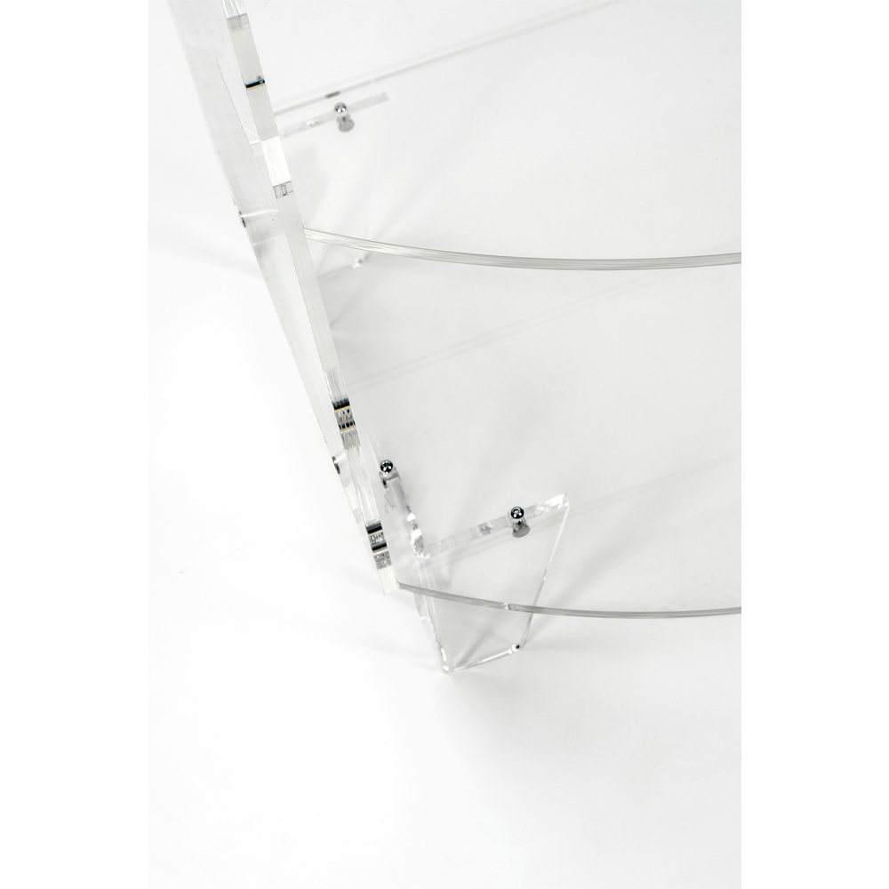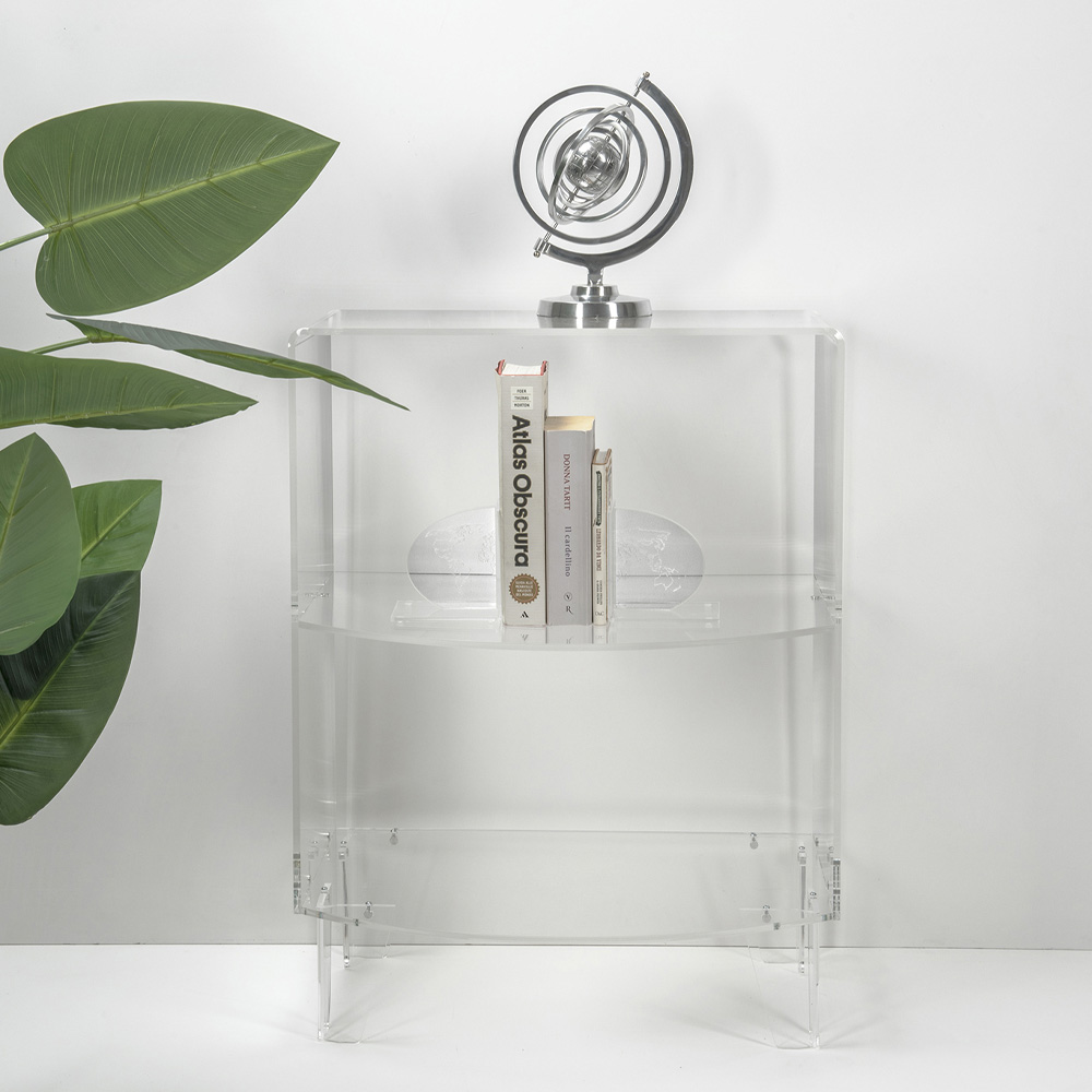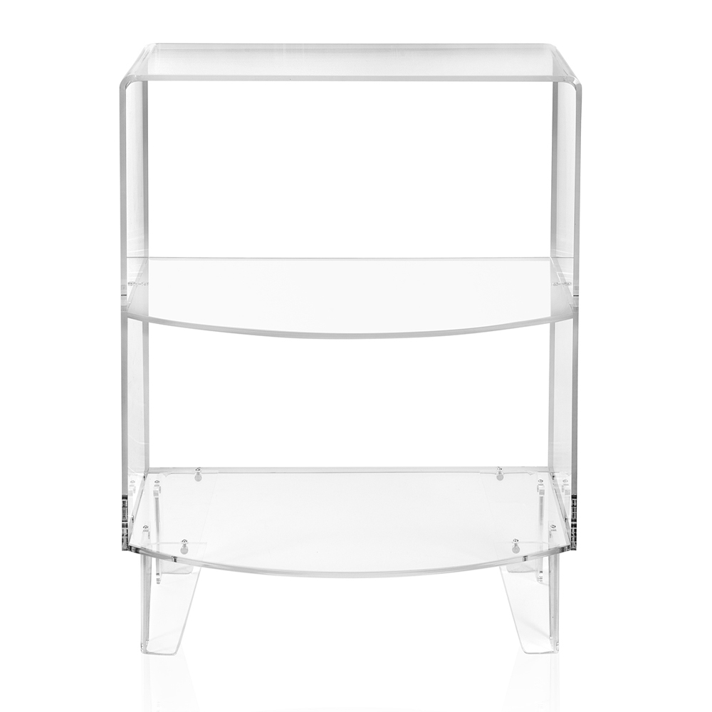 قطعة أثاث عملية ومتعددة الاستخدامات يمكن وضعها في غرفة النوم كطاولة بجانب السرير أو في غرفة المعيشة كطاولة قهوة . إن الشفافية والخطوط الأساسية التي تميزها تحدد تصميمًا عمليًا وحديثًا بفضل الرفين اللذين يمكن استخدامهما كحاملين للأشياء. مصنوع من زجاج شبكي PMMA بنسبة 100% من البوليمر البكر الذي يضمن سطوعًا وتألقًا ثابتًا وغير متغير بمرور الوقت.