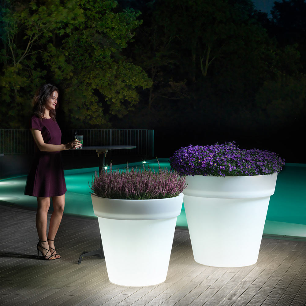 المزهرية الخارجية المضيئة المصنوعة من البولي إيثيلين اللؤلؤي في إيطاليا متوفرة بأحجام مختلفة لتزويد مساحة المعيشة الخارجية بالشخصية و استفد من وظائفها الأنيقة . يتضمن هيكلها أيضًا مجموعة تصريف مياه، مما يجعل هذه المزهرية عملية للغاية دون إغفال النتيجة النهائية، وهي جو مشع من الإضاءة الأنيقة واللافتة. إضاءة LED المدمجة تجعل هذه المزهرية الخارجية قطعة أثاث عصرية، بخطوط ناعمة تعكس أسلوبًا كلاسيكيًا أنيقًا للغاية.