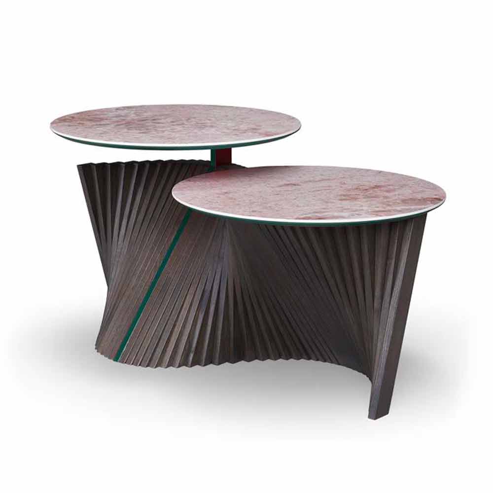 طاولة قهوة مصممة من الرخام المصقول والحجر الصناعي وخشب الدردار، وهي منتج إيطالي الصنع.