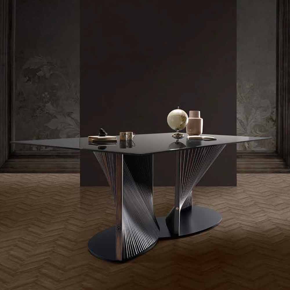 طاولة طعام بتصميم أنيق مصنوعة من الزجاج المدخن والخشب، عالية الجودة صنع في إيطاليا.