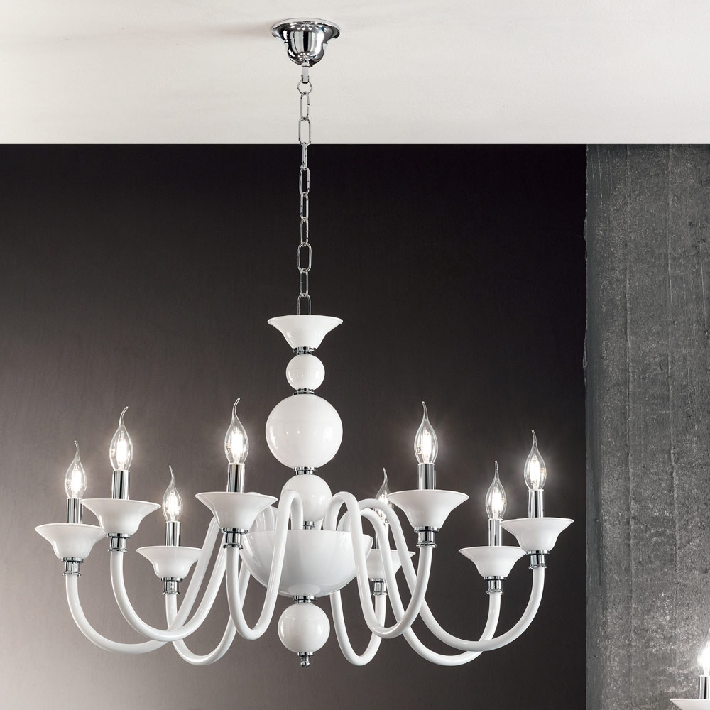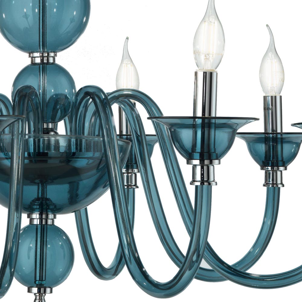 إن الروح النبيلة والمغرية لهذه الثريا ذات الثمانية مصابيح لا تترك مجالًا للتردد: فشخصيتها الحاسمة والحازمة ستصبح بطلة المشهد، لغرفة معيشة أنيقة أو غرفة نوم ملكية . مثالية لأولئك الذين يريدون إضاءة سينوغرافية بأسلوب الأوقات الماضية، تصميمها الكلاسيكي والفخم يتكون من كرات موضوعة واحدة فوق الأخرى لجسم الضوء، والتي تسمح بإلقاء نظرة خاطفة على قلب المعدن الكروم، ومن 8 أذرع مقوسة، مصنوعة بالكامل من الزجاج المصنوع يدويًا ومتوفرة في ظلال أنيقة مختلفة، من أجل أن تتناسب تمامًا مع أي مكان وتلبي احتياجات مختلفة.