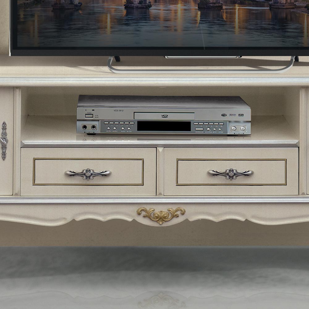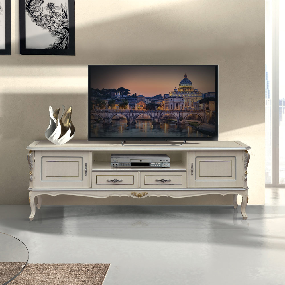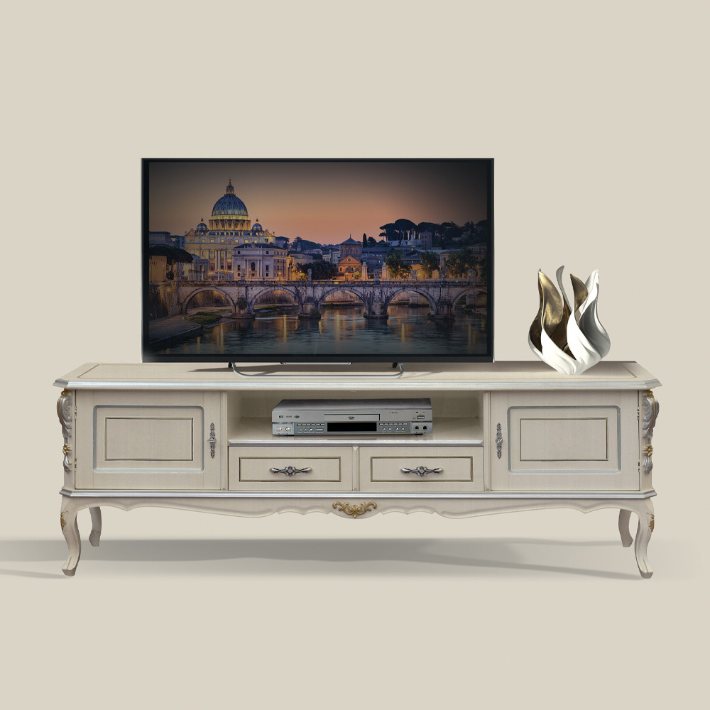 حامل تلفزيون قائم بذاته، مصنوع من خشب أبيض بلمسات فضية ، متوفر ببابين ودرجين، أو بابين ودرج واحد وحجرة واحدة، وهو مثالي لأي غرفة معيشة. يتجلى الأسلوب والحرفية اللذان يميزان هذه القطعة الفاخرة المصنوعة من خشب فاخر، في قطعة أثاث راقية تُضفي لمسةً أنيقة على أي مساحة.
