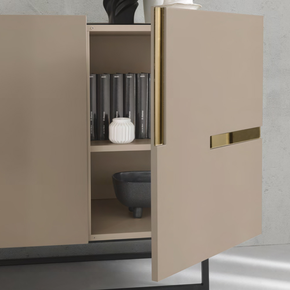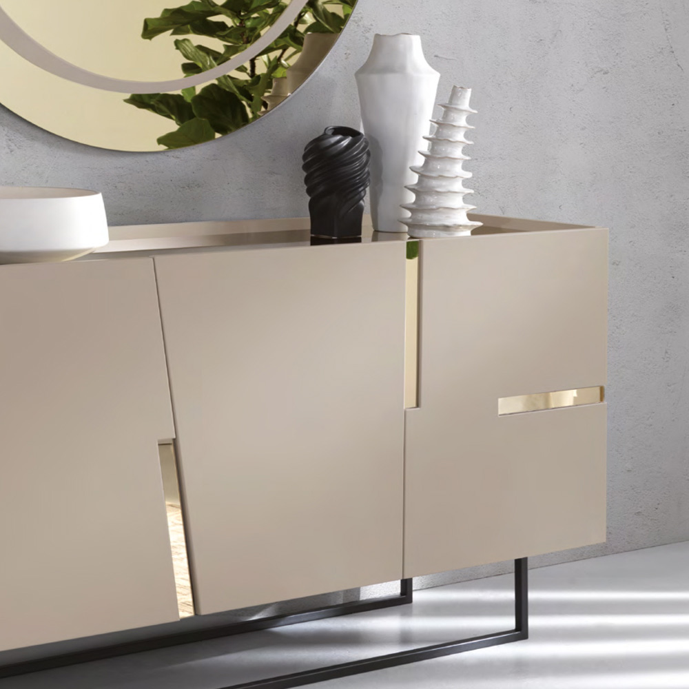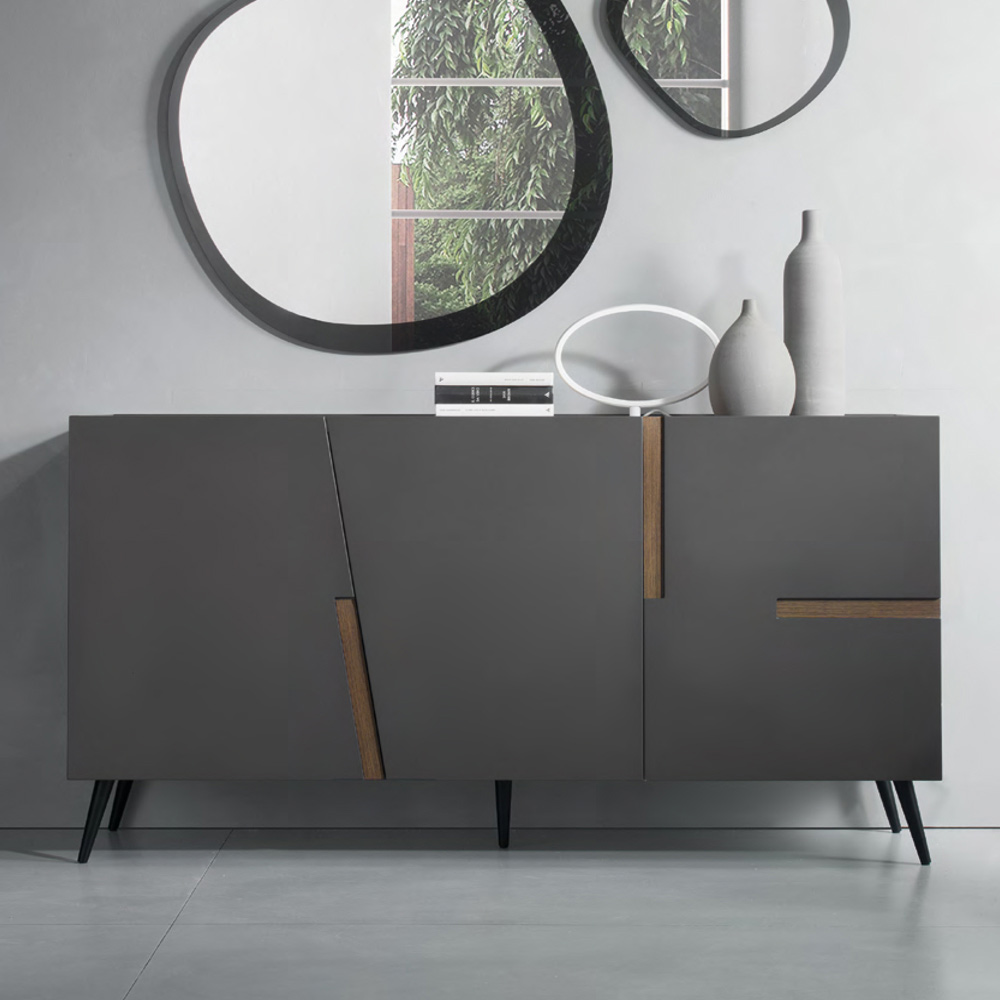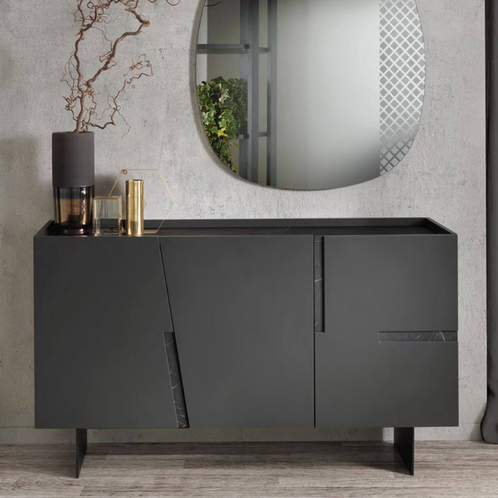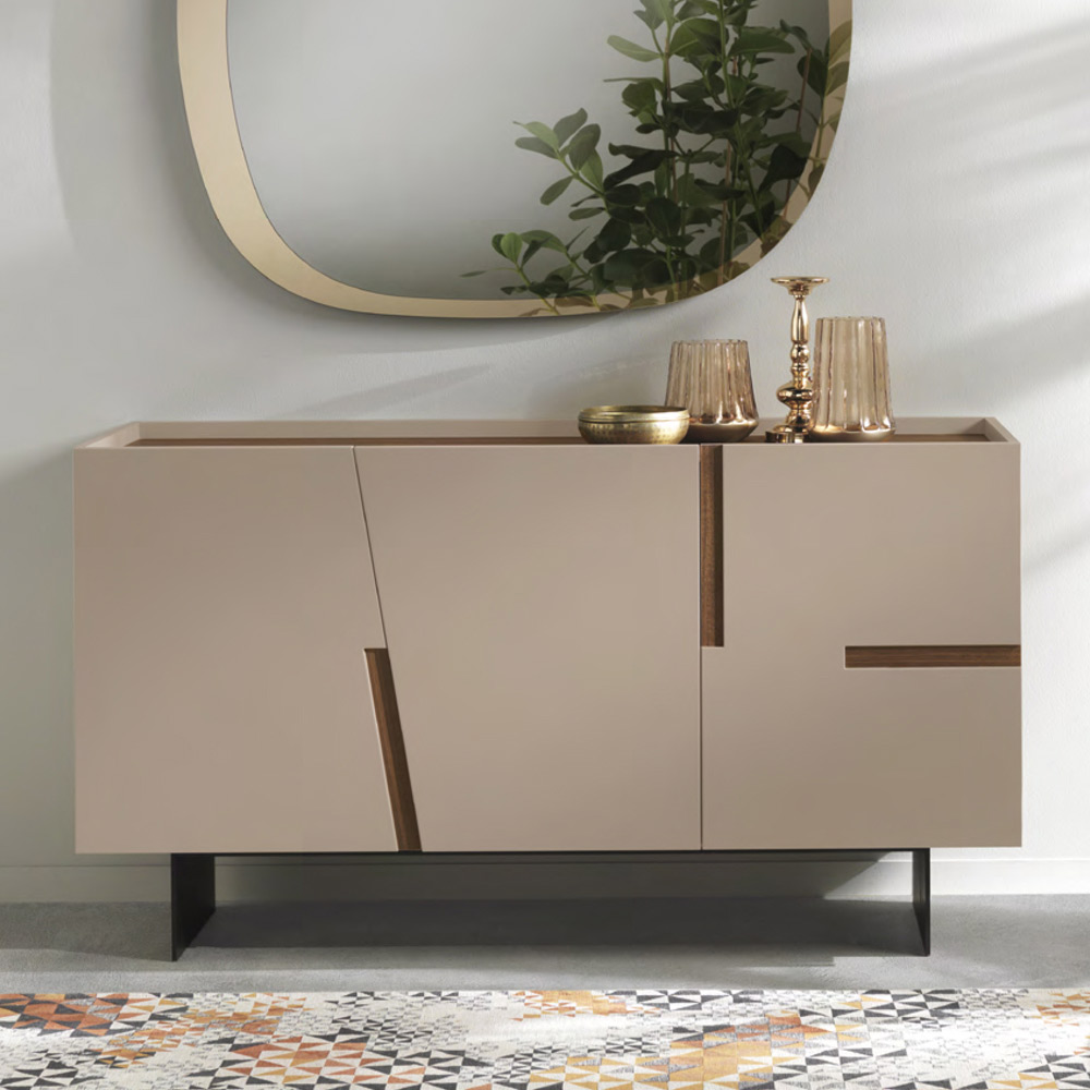 خزانة جانبية عصرية بهيكل من الميلامين ، وثلاثة أبواب من خشب MDF مطليّ ، مع رفّ عملي داخل كل باب، مُزينة بإضافات أنيقة من اللامينيت أو المرايا ، وقاعدة أو أرجل من المعدن المطلي باللون الأسود . قطعة أثاث تجمع بين العملية والتصميم المبتكر ، وتتميز بأشكالها البسيطة والصلبة، وتُضفي عليها لمسات من التباين الراقي بين المواد والتشطيبات. تصميم انتقائي ومتعدد الاستخدامات ، مُصمم ليناسب مختلف أرجاء المنزل، حيث يُضفي عليها لمسةً من الفخامة والرقي، ليصبح قطعةً مميزةً بفضل شخصيته العصرية القوية وحضوره المهيب .