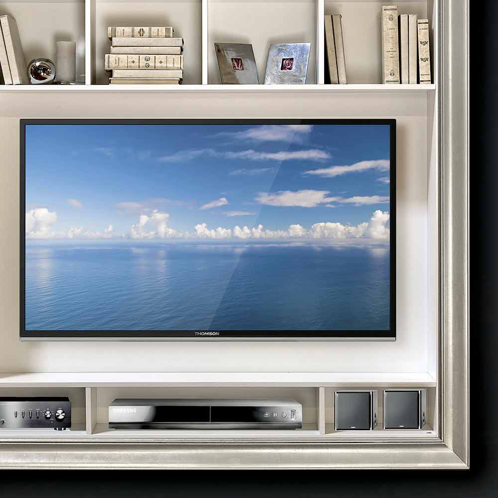 داخل الإطار، يوجد حجرة تلفزيون في المنتصف، محاطة بأرفف أنيقة تُتيح مساحةً للكتب والقطع الزخرفية، لإضفاء لمسة شخصية على المكان وإثراءه. أسفلها، توجد حجرات أنيقة مُرتبة لأجهزة الوسائط المتعددة، مما يُحافظ على نظافة المكان وخلوه من الأسلاك المكشوفة.