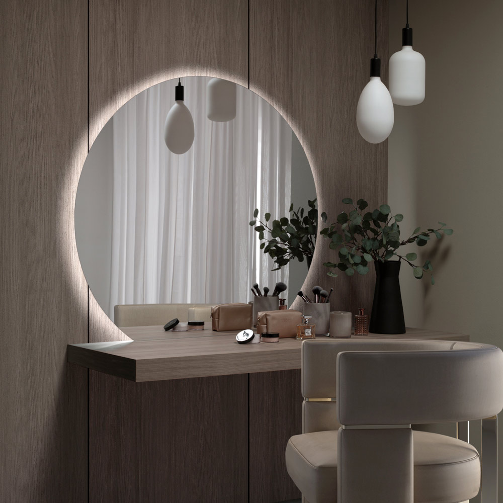 هذه المرآة الدائرية تحفة فنية في التصميم، تجمع بين الأناقة والحداثة. تُضفي الإضاءة الخلفية التي تُحيط بتصميمها توهجًا أثيريًا وضوءًا خافتًا يُضفي لمسةً من الأناقة على كل مكان، مُضفيًا جوًا من الود والرقي. يعكس شكل المرآة الدائري، الذي يُعد خيارًا أنيقًا خالدًا، الضوء الطبيعي وجمال المساحة المحيطة ويُعززهما. تُعتبر هذه المرآة المُضاءة من الخلف مثاليةً للمدخل أو الحمام أو كنقطة محورية في غرفة المعيشة، فهي ليست مجرد عنصر عاكس، بل قطعة أثاث حقيقية تجمع بين الشكل والوظيفة، والجمال والسطوع، لتُضفي لمسةً من الأناقة والجو المميز.