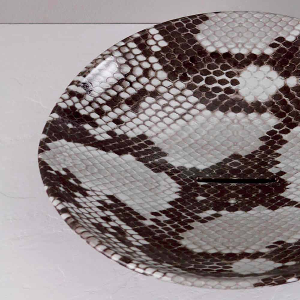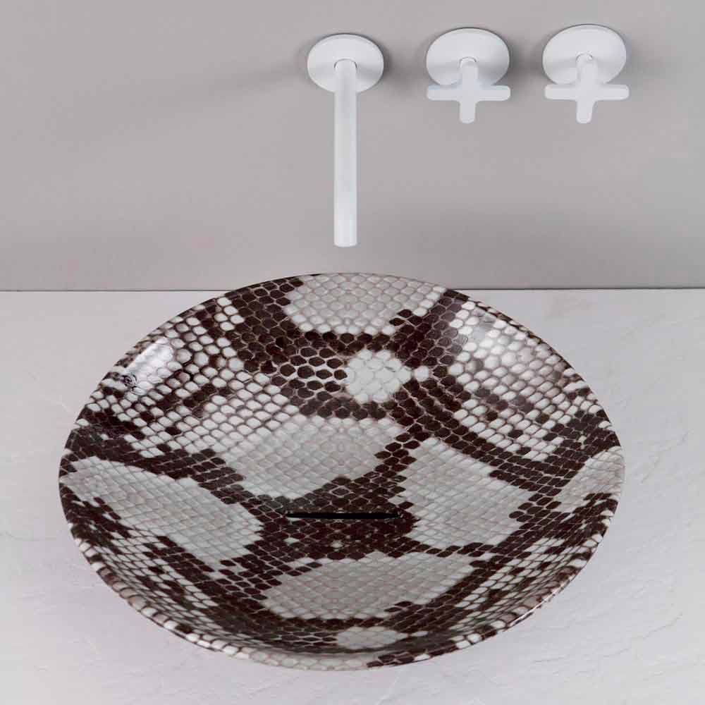 حوض غسيل من السيراميك من كوبرات، صنع في إيطاليا، حيوانات حوض غسيل أو "حوض" ذو شكل غير منتظم، يشبه قسم اللوز، ومجهز بتصريف مياه مستمر. يمكن تخصيص حوض الغسيل هذا عن طريق الاختيار بين التشطيبات والديكورات المختلفة: لطلب معلومات و / أو عرض أسعار شخصي، اكتب إلى clienti@viadurini.it.