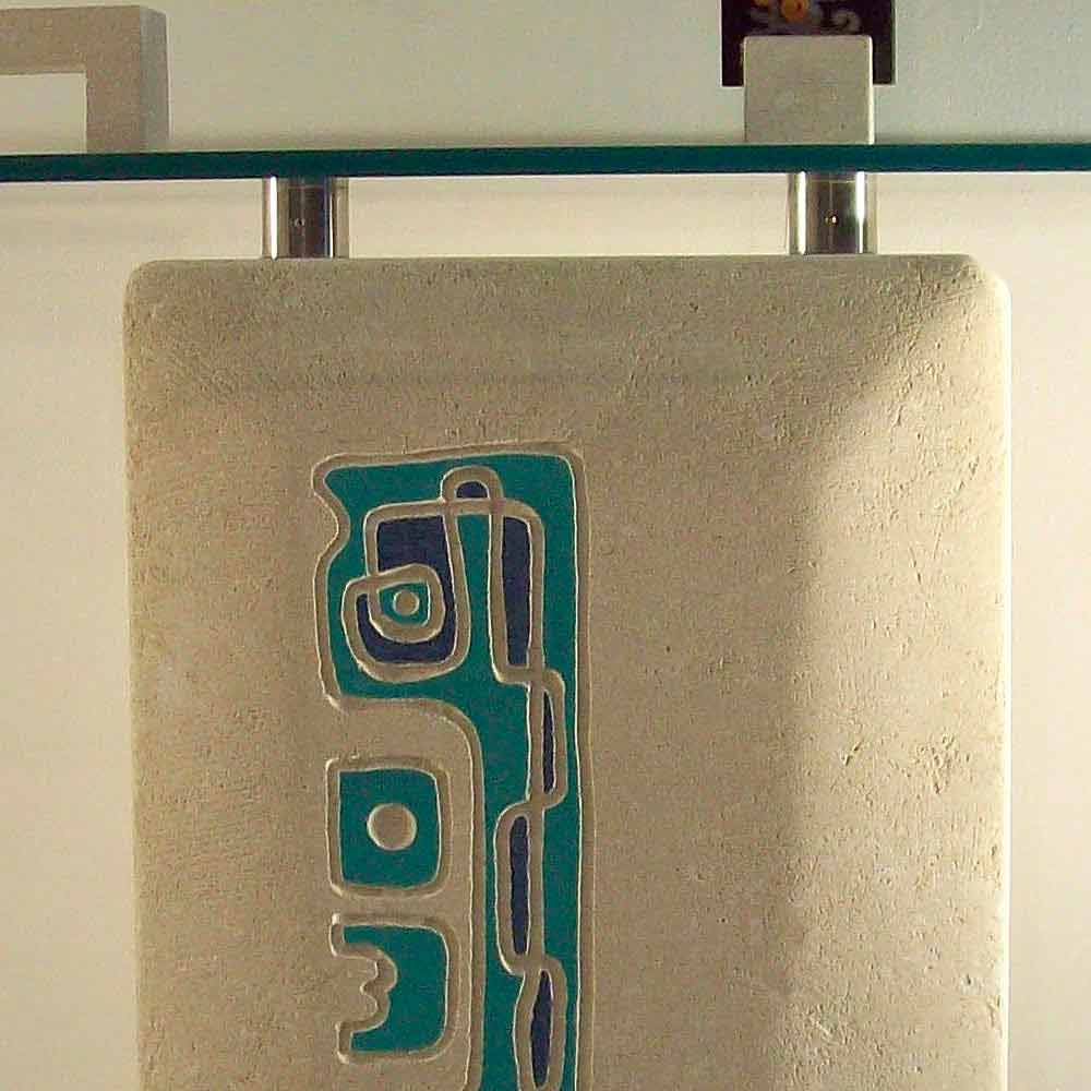 طاولة كونسول حديثة مع سطح من الكريستال وقاعدة من الحجر الطبيعي من سوتر طاولة الكونسول سوتر مصنوعة بالكامل في إيطاليا . قاعدتها مصنوعة من حجر فيتشنزا الطبيعي، ونُحتت يدويًا من كتلة الحجر الأصلية. سطح الطاولة مصنوع من كريستال عائم (سمكه 15 مم)، مثبت على القاعدة بفلنشتين فولاذيتين قابلتين للإزالة. يتكون حجر فيتشنزا الطبيعي في الغالب من كربونات الكالسيوم، والذي نشأ من انهيار الشعاب المرجانية واستقرار الكائنات البحرية، مثل الأصداف والقشريات والطحالب، في قاع البحر. تأتي طاولة الكونسول Soter مع شهادة أصالة مرقمة.