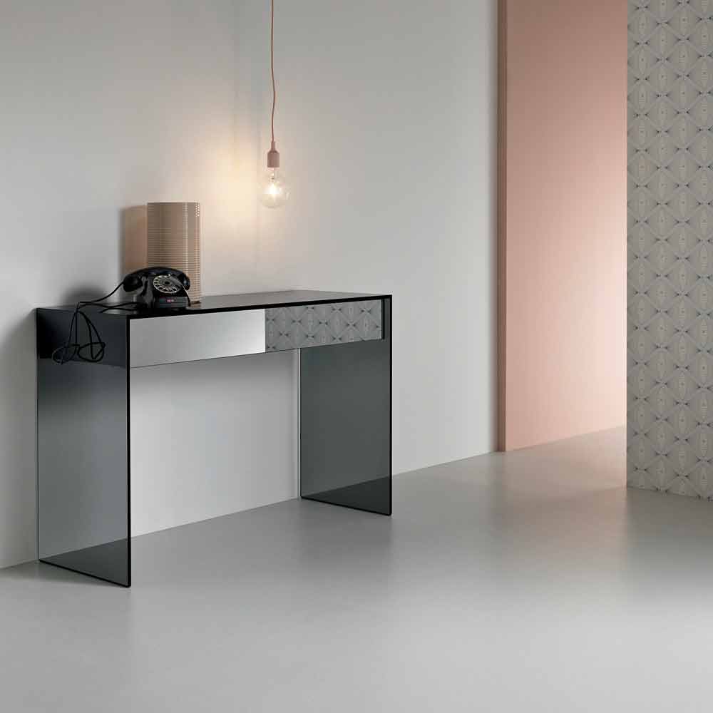 مكتب كونسول حديث مصنوع يدويًا في إيطاليا من الزجاج الدخاني مع درج خشبي.