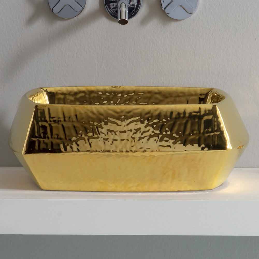 حوض غسيل مصمم من السيراميك الذهبي من إنتاج سيمون الإيطالي سيمون هو حوض غسيل سطح العمل بتصميم عصري وأنيق، يتميز بخطوط وأشكال قوية. بفضل شكلها المائل قليلاً وقطعها النظيفة واللمسة النهائية الذهبية، ستكون بطلة حمامك