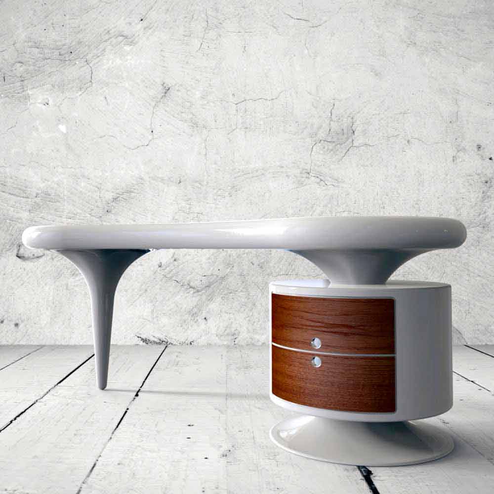 لمسة من الرجعية. المواد: سطح صلب والخشب. يشكل المخروط الشكل الرسمي للمكتب، وفي حين أنه يدعم الجزء العلوي المصمم بشكل خفيف على جانب واحد، فإنه يصبح على الجانب الآخر العنصر الحامل لخزانة الأدراج. التباين المادي الذي توفره حداثة Solid Surface؛ مع "دفء" الخشب والأشكال المستديرة التي تمنح لمسة رجعية لمكتب Bean، والتكيف مع أي نوع من البيئة. طلاء لامع. متوفر في اختلافات الألوان المختلفة.