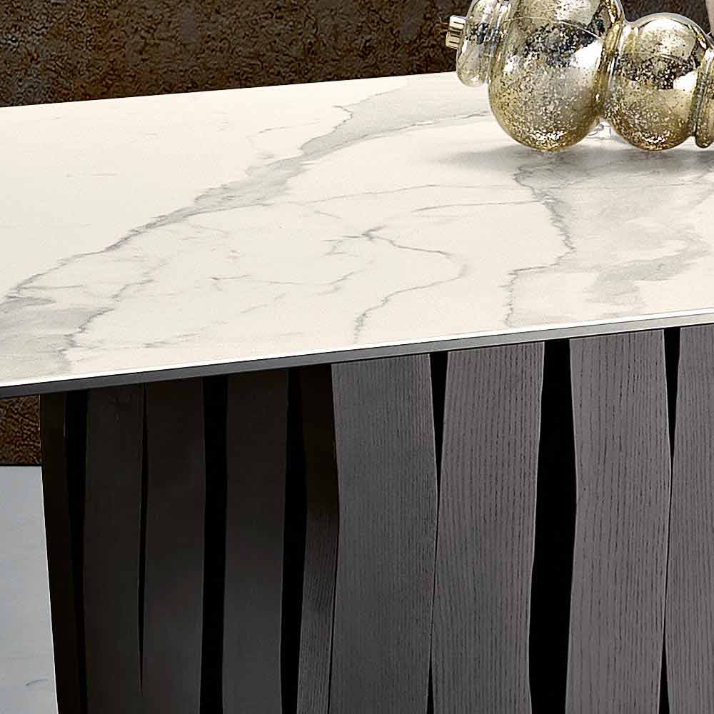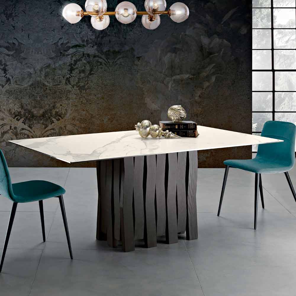 Egisto عبارة عن طاولة ثابتة أنيقة تم تصنيعها في إيطاليا بسطح من السيراميك الزجاجي وقاعدة من خشب الدردار الصلب .