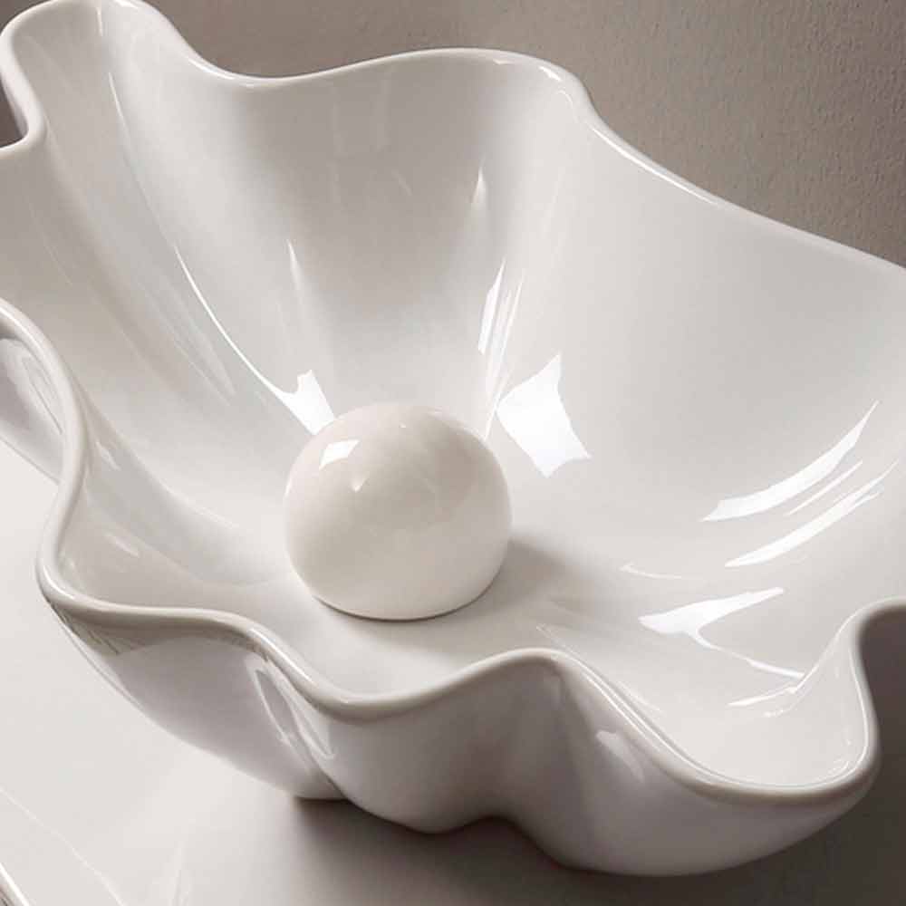 حوض غسيل يذكرنا بالبحر من خلال فتحة تصريفه على شكل لؤلؤة، مما يخلق الوهم بأنه محارة.