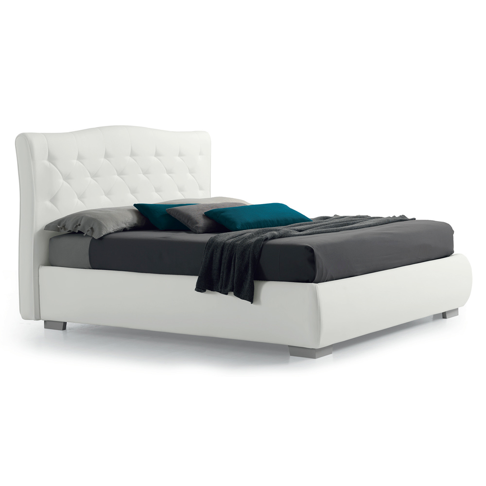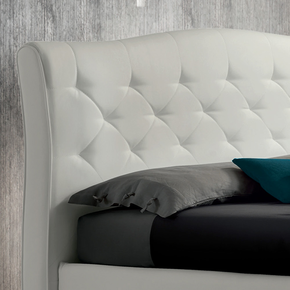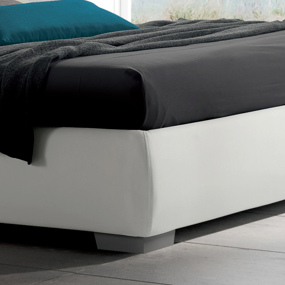 سرير مزدوج مع صندوق تخزين ولوح رأس مبطن من الجلد البيئي، صنع في إيطاليا.