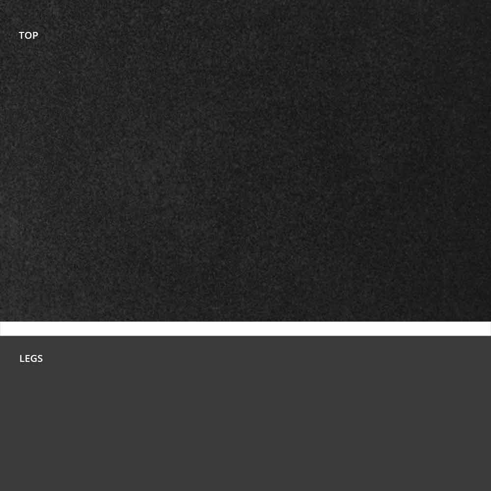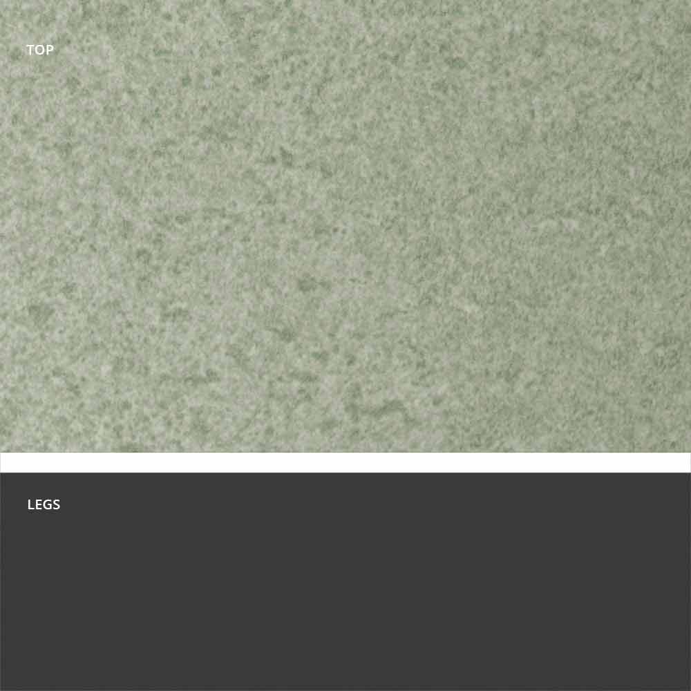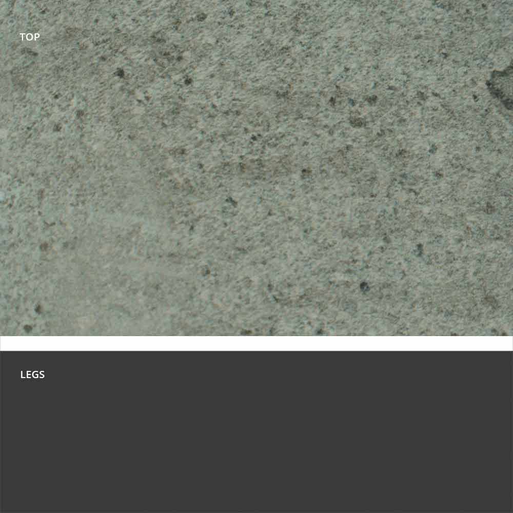 مصنوعة يدويًا في إيطاليا بثلاثة تشطيبات مختلفة: - قاعدة من المعدن الأسود الرمادي (RAL 7021) وسطح من الفخار باللون الأبنوسي والراتنج. - قاعدة من المعدن الأسود الرمادي (RAL 7021) وسطح من الفخار باللون البازلتي الرملي؛ - قاعدة من المعدن الأسود الرمادي (RAL 7021) وجزء علوي من الخزف الحجري باللون الدخاني.