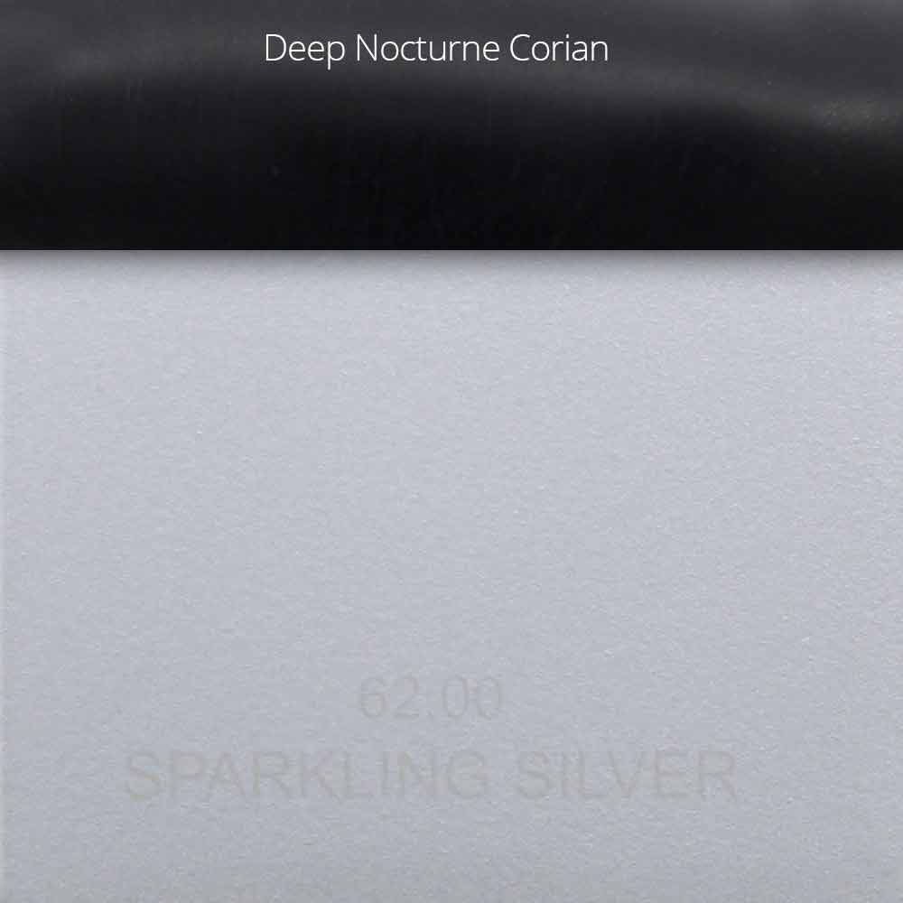 اللون الفضي اللامع + اللون الليلكي العميق Corian®: لمسة نهائية معدنية فضية غير لامعة مع عناصر باللون الأسود DuPont ™ Corian®؛
