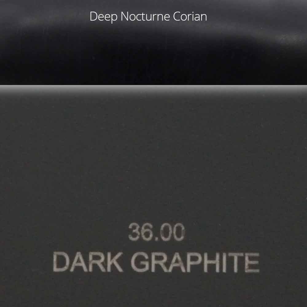 Corian® بلون الجرافيت الداكن + Corian® بلون الليل العميق: لمسة نهائية رمادية داكنة باردة غير لامعة مع عناصر باللون الأسود من DuPont ™ Corian®؛
