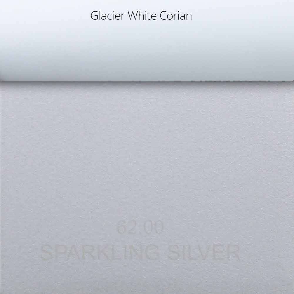 Corian® باللون الفضي اللامع + الأبيض الجليدي: لمسة نهائية معدنية باللون الفضي غير اللامع مع عناصر Corian® باللون الأبيض من DuPont ™؛