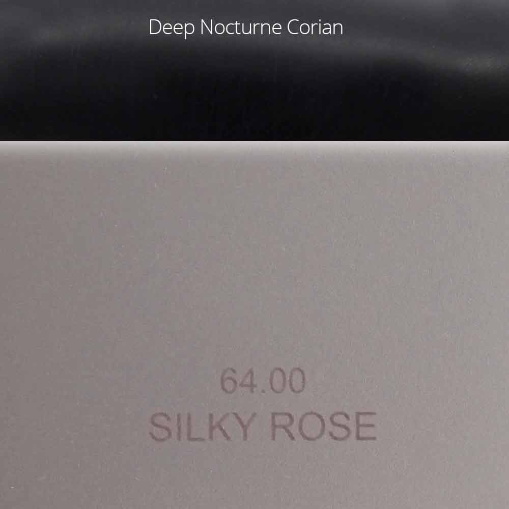 Silky Rose + Deep Nocturne Corian®: لمسة نهائية معدنية باللون الوردي غير اللامع مع عناصر DuPont ™ Corian® باللون الأسود؛