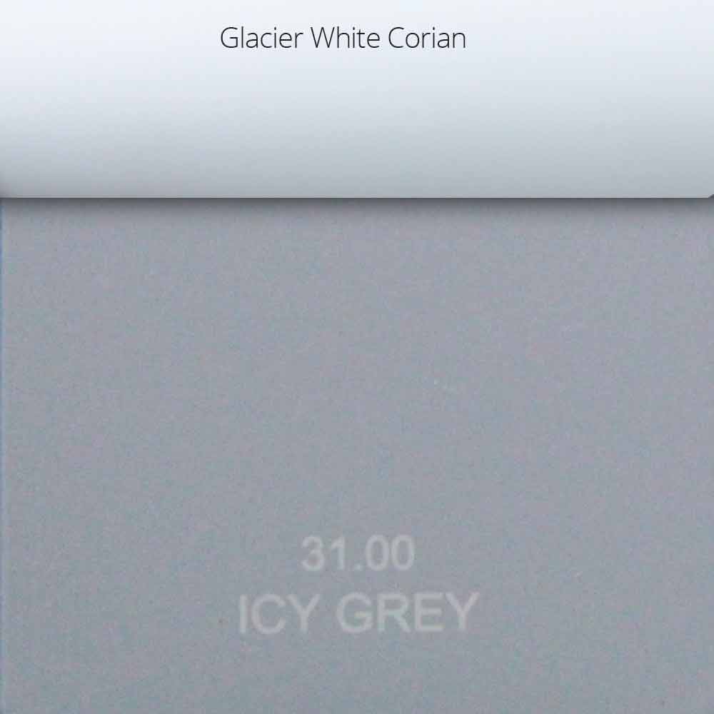 Corian® باللون الرمادي الجليدي + الأبيض الجليدي: لمسة نهائية باللون الرمادي الفاتح البارد غير اللامع مع عناصر Corian® باللون الأبيض من DuPont ™؛