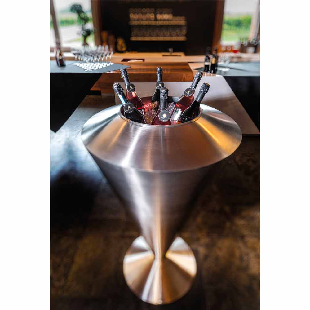 فرابيه أرضية مصنوعة بالكامل في إيطاليا من الفولاذ المقاوم للصدأ مع حامل لزجاجات الثلج. مثالية لتزيين الحانات والمطاعم، وكذلك المساحات المنزلية المخصصة لتناول الطعام، تتميز هذه القطعة بتصميم عصري وعملي، وتوفر حلاً مثاليًا للحفاظ على برودة النبيذ مع إثراء الأثاث المحيط. استخدام الفولاذ يزيد من كفاءتها ويتيح لها التكيف مع أي نمط بشكل متناغم ومثالي، للحصول على نتيجة أصلية وبسيطة في آن واحد. وتزداد قيمتها بفضل تصنيعها الإيطالي 100%، بالإضافة إلى استخدام مواد خام عالية الجودة ، مما يضمن منتجًا متينًا ومتينًا يتمتع بمتانة ممتازة .