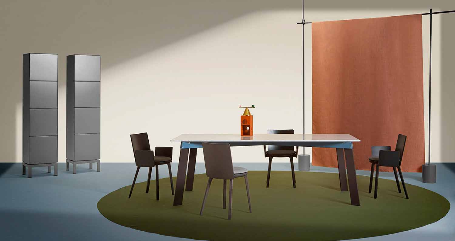 طاولة فولاذية حديثة ذات هيكل متقاطع وسطح من الرخام المصمم متوفرة بحجمين مصنوعة في إيطاليا.
