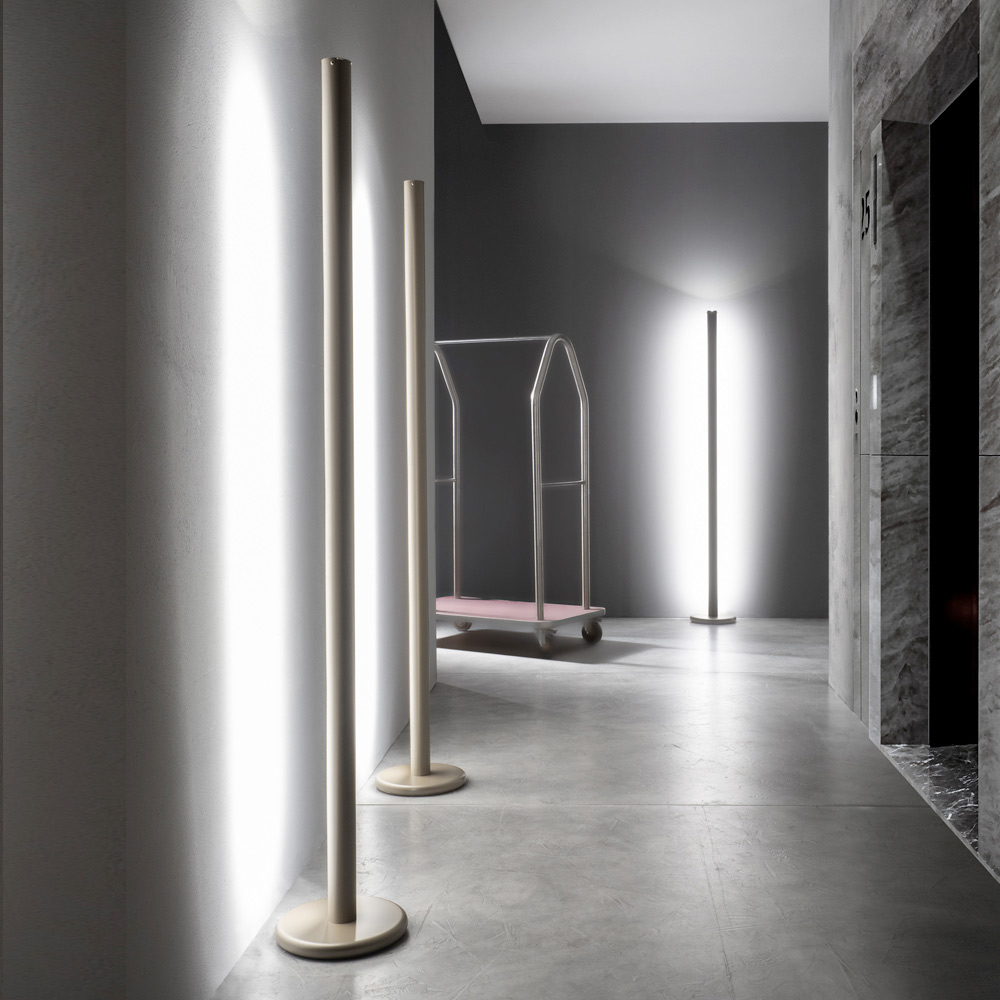 مصباح أرضي معدني بإضاءة عمودية مزدوجة، تصميم عصري صنع في إيطاليا.
