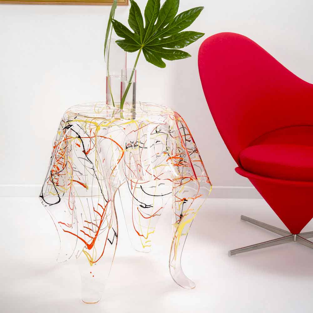 طاولة قهوة متعددة الألوان من زجاج شبكي، صنع في إيطاليا، أوتو طاولة أوتو المُغطاة قطعة فنية فريدة، تُجسّد الفن الحديث. مصنوعة من صفائح بوليمر نقية 100% من زجاج شبكي PMMA نقي، مُرشوشة بالطلاء، ومُغطاة يدويًا بدرجات حرارة عالية، لتُشكّل طاولة فريدة لا تُضاهى.