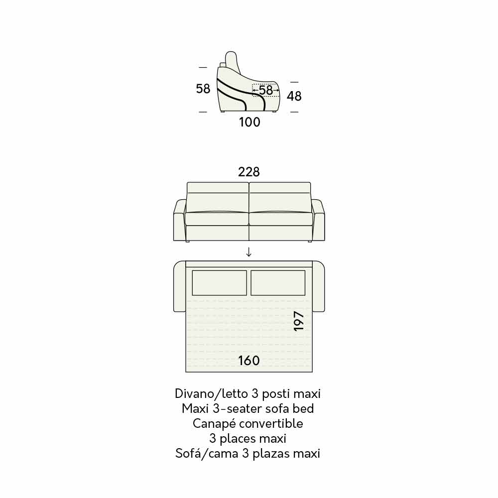الطول 228 × العرض 100 × الارتفاع 104 سم (المرتبة: الطول 160 × العرض 197 × الارتفاع 14 سم).