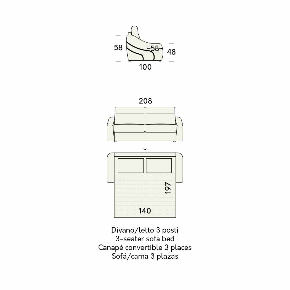 تتضمن الأريكة قاعدة ملحومة كهربائيًا بإطار أنبوبي مزود بآلية طي عملية تُسهّل فتح السرير بسرعة ودون الحاجة إلى إزالة الوسائد. كما أنها مزودة بمرتبة من إسفنج البولي يوريثان متوسط الكثافة غير القابل للتشوه (25 كجم/م3) مغطاة بقماش بوليستر 100% مضاد للحساسية ومضاد للحساسية وجيد التهوية، مع مثبتات فيلكرو تمنع الانزلاق. بفضل نظام التثبيت، يمكن فك هيكل الأريكة وإزالته بالكامل، مما يسمح بغسل القماش براحة، مما يضمن أقصى قدر من العملية حتى عند إزالته.