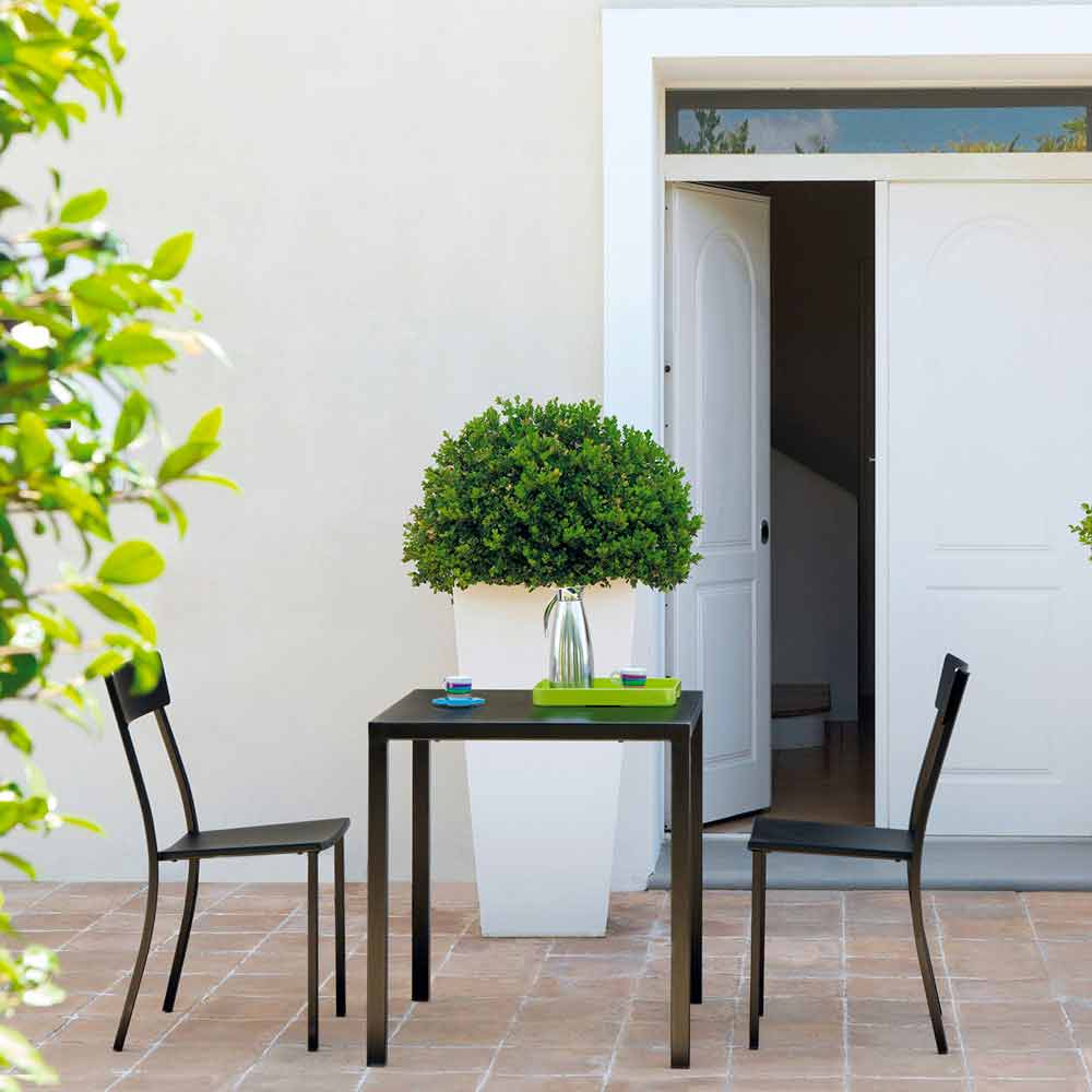 طاولة خارجية مربعة مصنوعة من الحديد المجلفن المطلي بالمسحوق، ذاتية التسوية وقابلة للتكديس، صنع في إيطاليا.