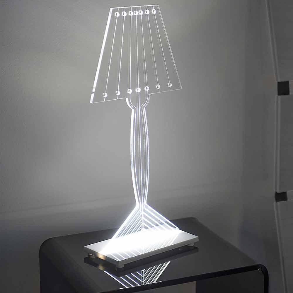 مصباح طاولة LED مصبوب، Ferla مصباح LED أنيق للطاولة/جانب السرير، مصنوع من زجاج شبكي PMMA 100% من البوليمر البكر. بفضل ميزاتها التقنية، تعمل الكريستالات الأكريليكية على إضاءة وتعزيز شكل المنتج. LED 24 فولت، 3.2 واط. ضوء طبيعي 4000 درجة كلفن. مزود طاقة 220 فولت وفقًا للوائح CE مع قابس 24 فولت. إن زجاج PMMA المستخدم من البوليمر البكر غير سام، ومضاد للحساسية، وعديم الرائحة ومضاد للبكتيريا. وقابل لإعادة التدوير بنسبة 100%. مستوى الحماية : IP20؛ طريقة التحكم : مفتاح يدوي؛ تم تصميمها وتصنيعها في إيطاليا باستخدام مواد إيطالية.