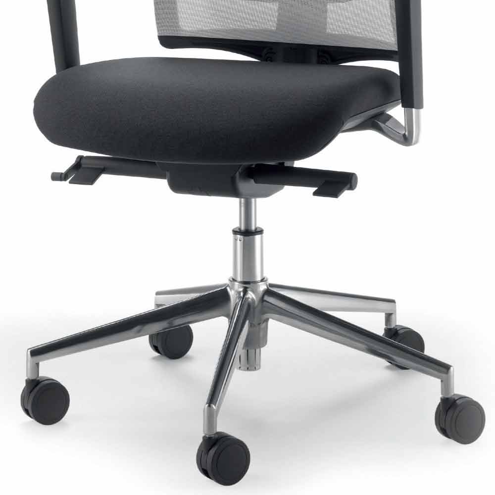قاعدتها ذات الخمس نجوم مصنوعة من النايلون PA6، وألياف زجاجية بنسبة 30%، ولون أسود، وحاصلة على شهادة ANSI-BIFMA، وعجلات من النايلون بفرامل Ø50.