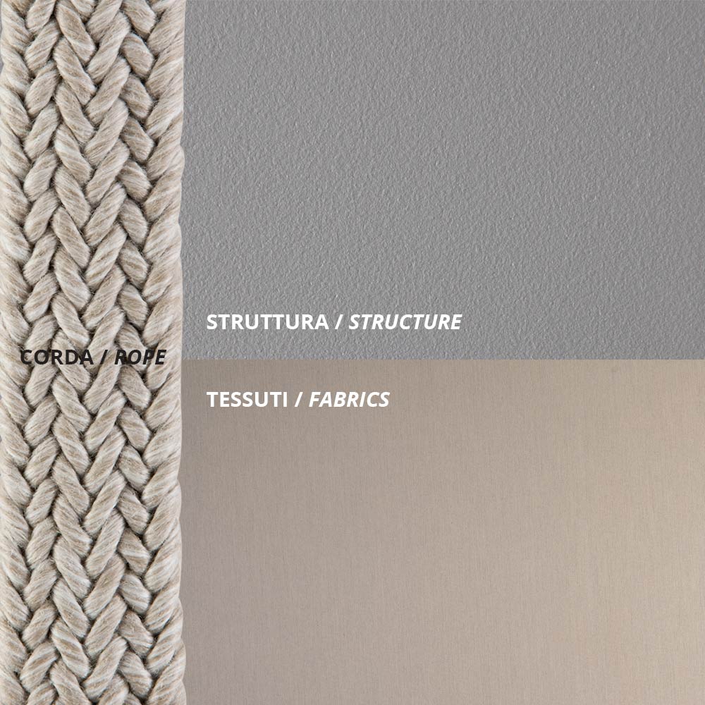 كرسي حديقة بذراعين من الفولاذ المجلفن، مزود بمقعد وظهر من البولي بروبيلين ، ومساند ذراعين قابلة للإزالة من الحبل.صُنع بالكامل في إيطاليا . يُعزز الجلفنة من مقاومة المادة للعوامل الجوية المسببة للتآكل، بينما يُقاوم الحبل الكلور وأشعة الشمس، بالإضافة إلى مقاومته للعفن. الوسائد مصنوعة من مادة مقاومة للأشعة فوق البنفسجية والماء، مما يُحافظ على لونها لفترة طويلة.