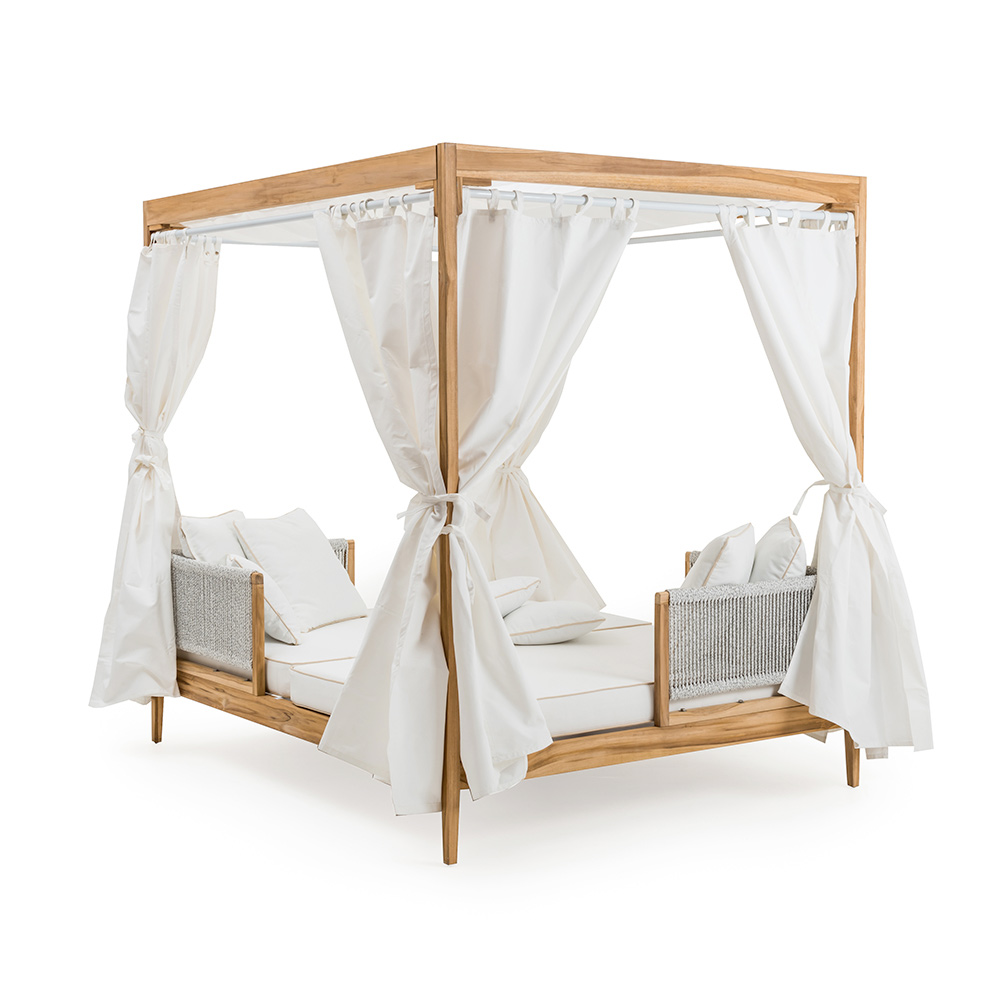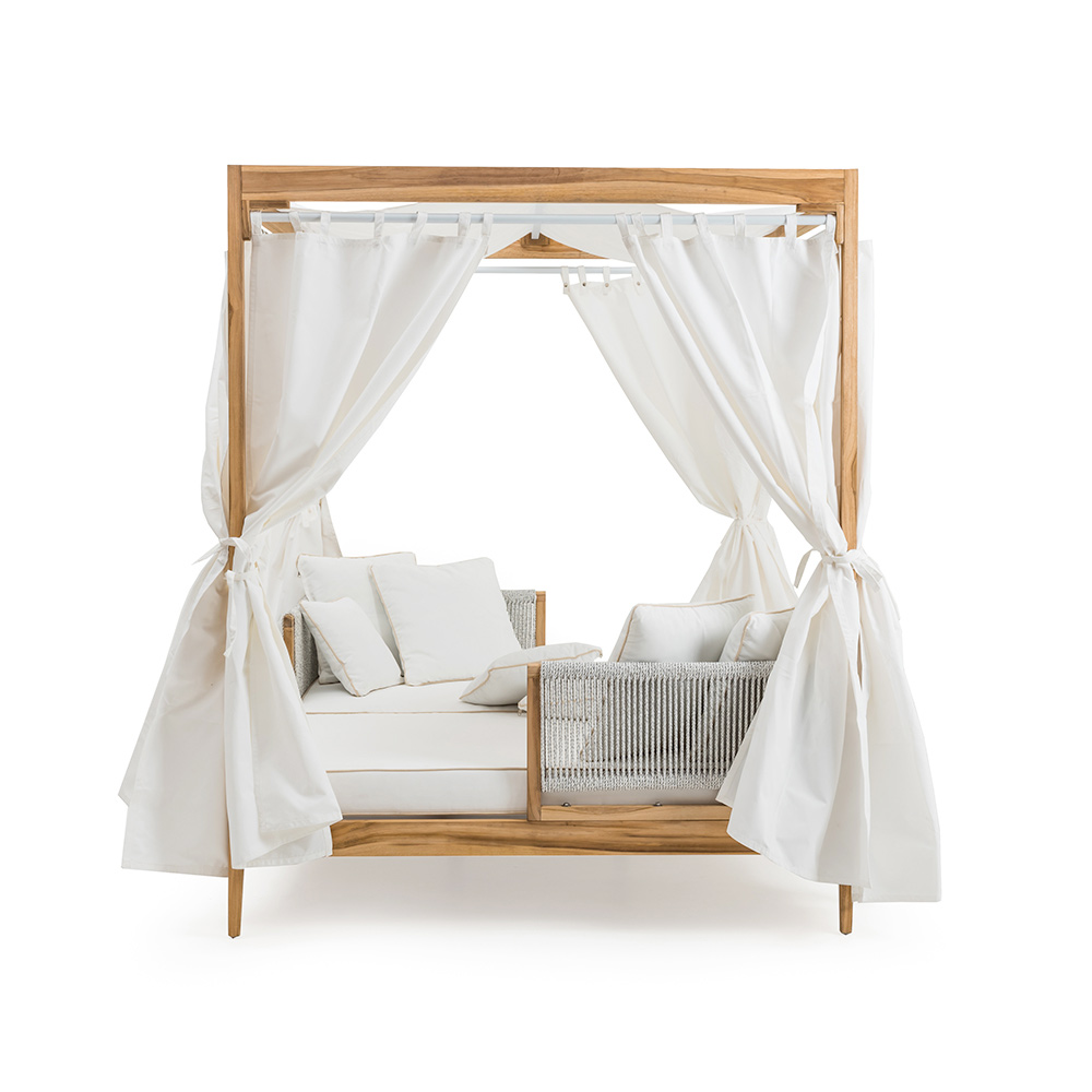 يتميز هذا السرير النهاري بهيكل من خشب الساج الطبيعي ونسيج أبيض عاجي قياسي، في حين أن الوسائد مقاومة للماء وبيضاء اللون مع حواف متباينة الألوان.
