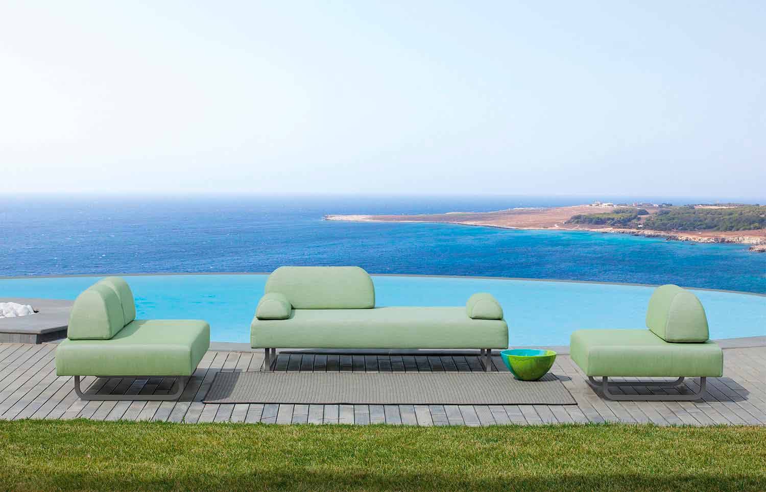 تشكيلة غرفة معيشة خارجية تجمع بين الطابع الكلاسيكي والمستقبلي، وتتألف من أريكة بمقعدين، وأريكة بثلاثة مقاعد، وكرسي بذراعين. تتميز كل قطعة بهيكل داخلي خشبي متين وبطانة مبطنة بقماش أكريليك مصبوغ 100% للاستخدام الخارجي، ومقاومة للبقع والعفن والأشعة فوق البنفسجية ، بالإضافة إلى جميع الظروف الجوية. يتضمن التكوين: - وحدة واحدة 90 × 90 × ارتفاع المقعد 40 سم - كنبة ذات مقعدين 150×90 × ارتفاع المقعد 40 سم - كنبة 3 مقاعد 190×90 × ارتفاع المقعد 40 سم