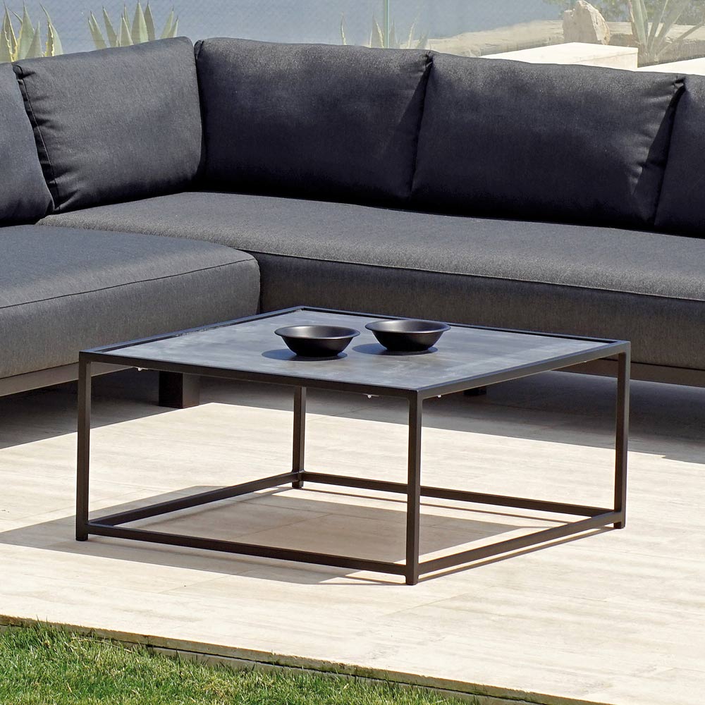 صالة حديقة مع أريكتين وهيكل من الألومنيوم الأسود وطاولة قهوة من السيراميك.
