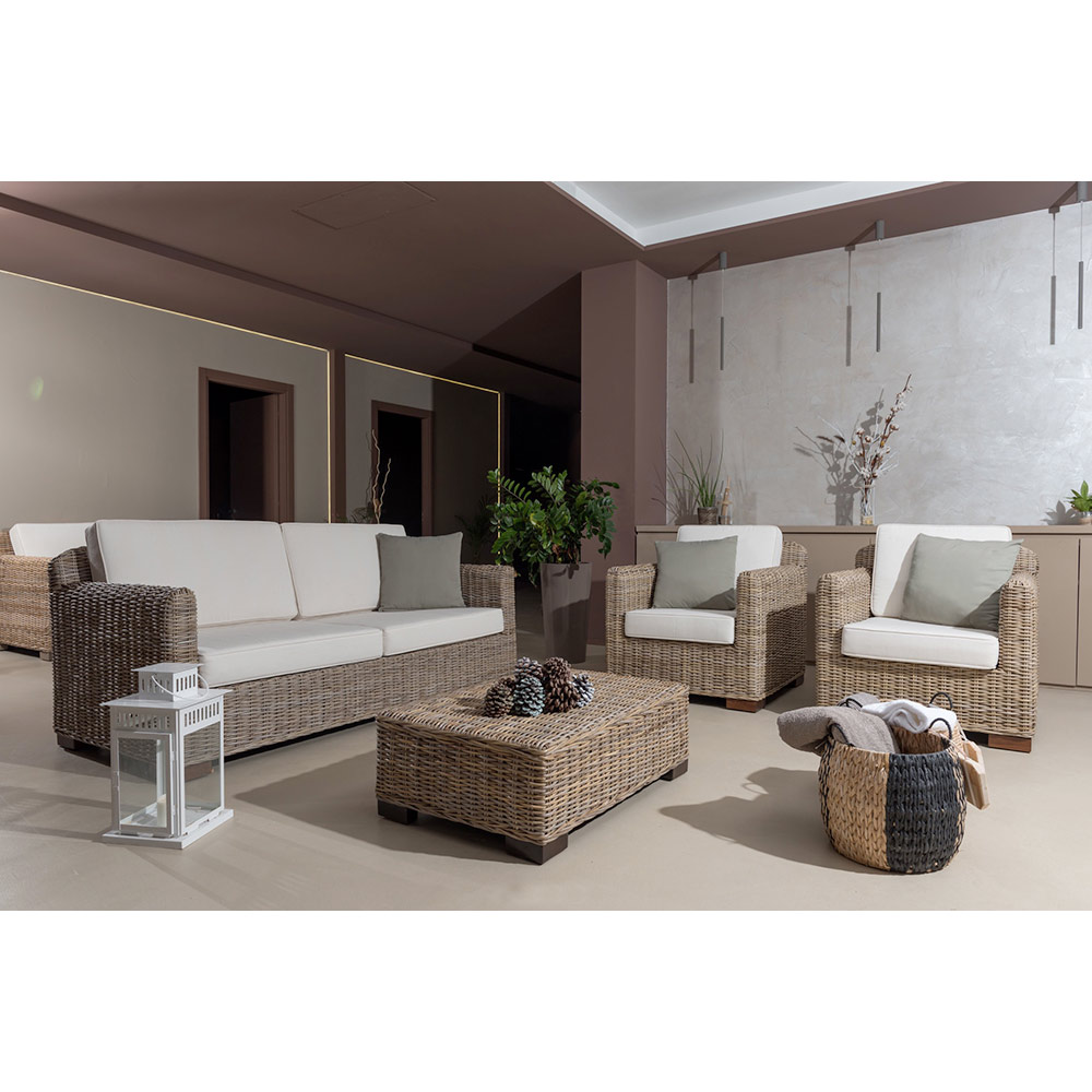 مجموعة صالة خارجية تتكون من كرسيين بذراعينوأريكةبثلاثة مقاعدوطاولة بوف من قماش كوبو رمادي منسوج يدويًا مع وسائد قياسية متضمنةباللون " Ecru " القياسي.