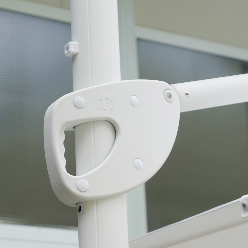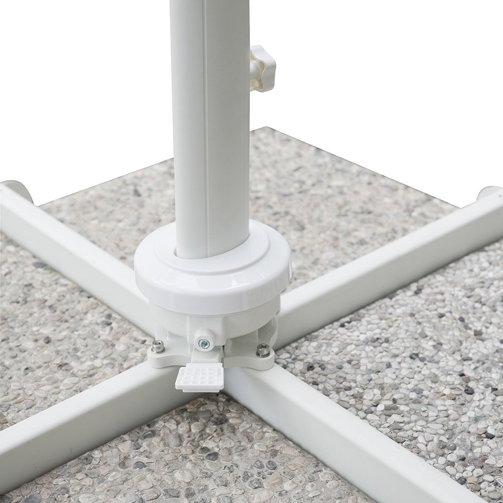 مظلة حديقة من القماش المصنوع من البوليستر الأبيض300 جرام مع حماية عالية من الأشعة فوق البنفسجية ، قابلة للدوران حتى 360 درجة مع مقاومة للرياح و 8 قضبان (16 × 28 مم)، هيكل من الألومنيوم بقاعدة متقاطعة أقصى ارتفاع مع قاعدة 2.80 متر كاملة مع المقبض والغلاف.
