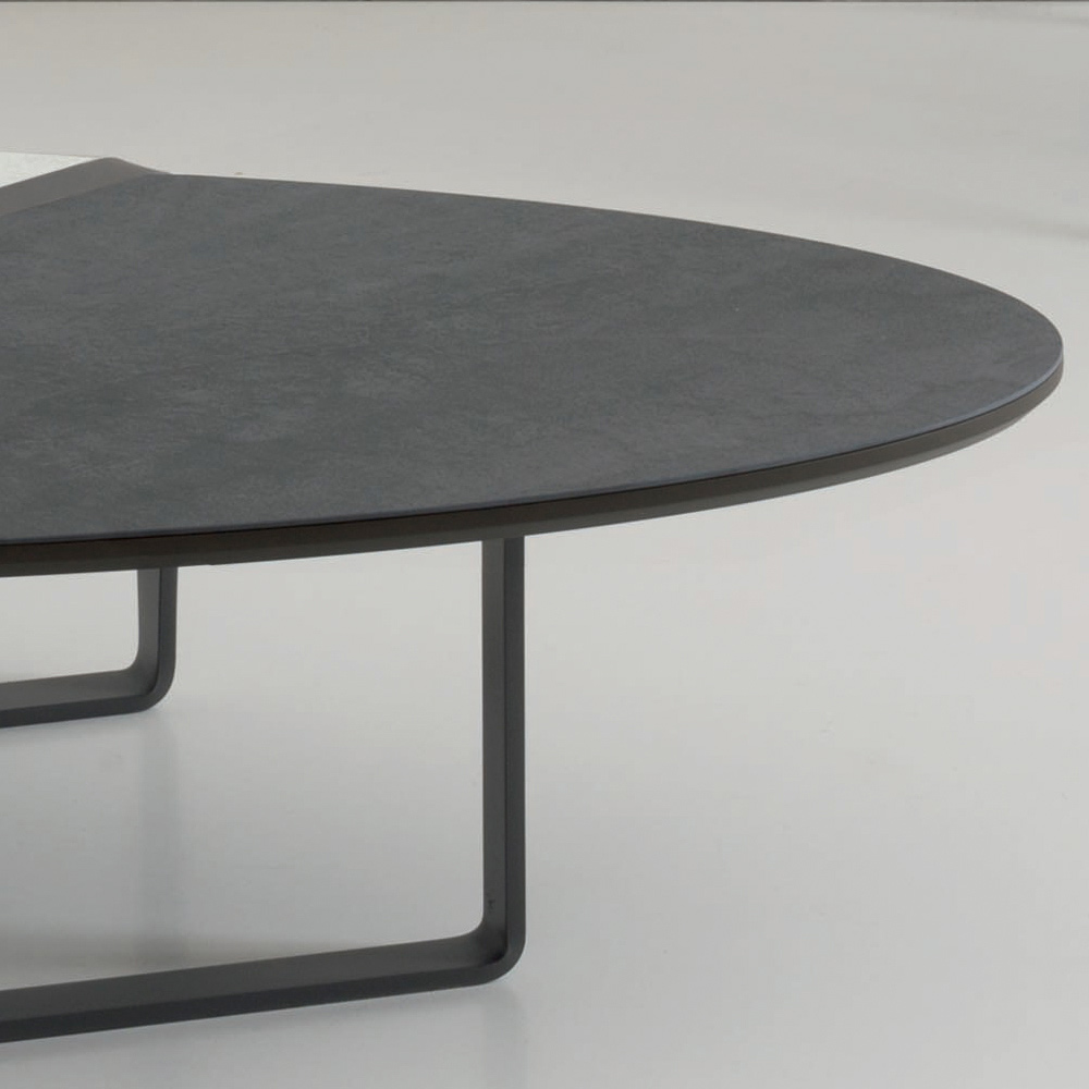 طاولة قهوة بيضاوية مصنوعة من المعدن مع سطح من السيراميك ثنائي اللون مصنوعة في إيطاليا.