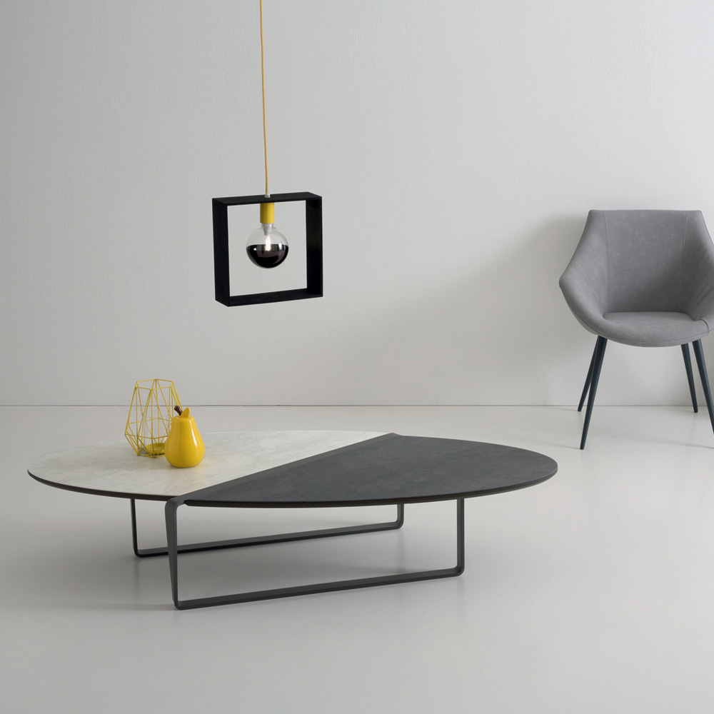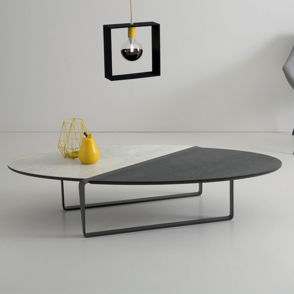 تتميز طاولة القهوةذات التصميم البيضاوي هذه بقاعدة معدنية مطلية بمسحوق الجرافيت المنقوش وسطح من السيراميك غير اللامع ثنائي اللونعلى اللوحة. تتميز هذه المجموعة بسطحها العلوي المصنوع من حجر الأنثراسيت من سافوي وحجر اللؤلؤ من سافوي. لمسة نهائية مزدوجة لعشاق الضوء والألوان. يقوم الهيكل المعدني بفصل وتوحيد النصفين في نفس الوقت في لعبة التناقضات التي تعطي الحياة والشخصية للمنطقة المحيطة.